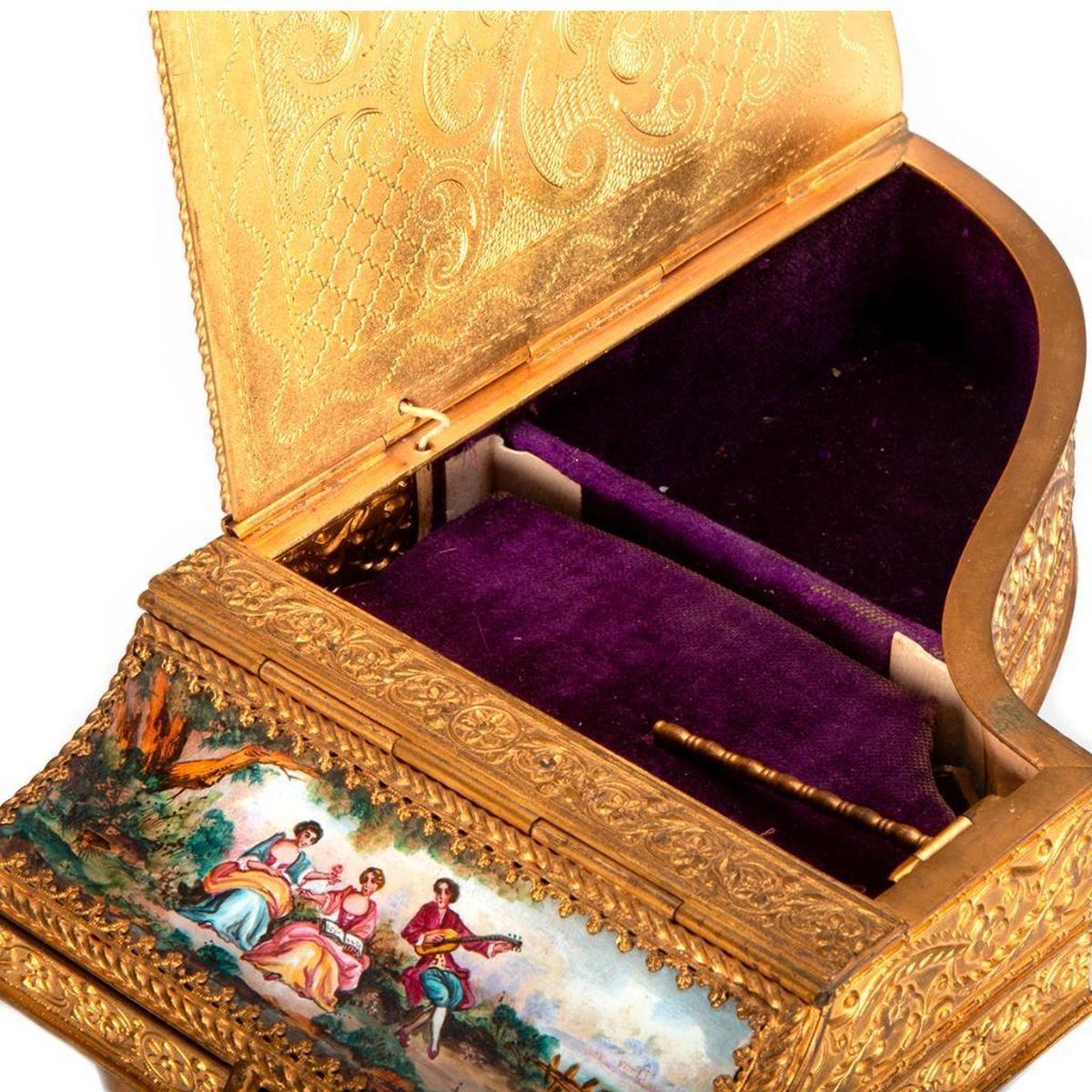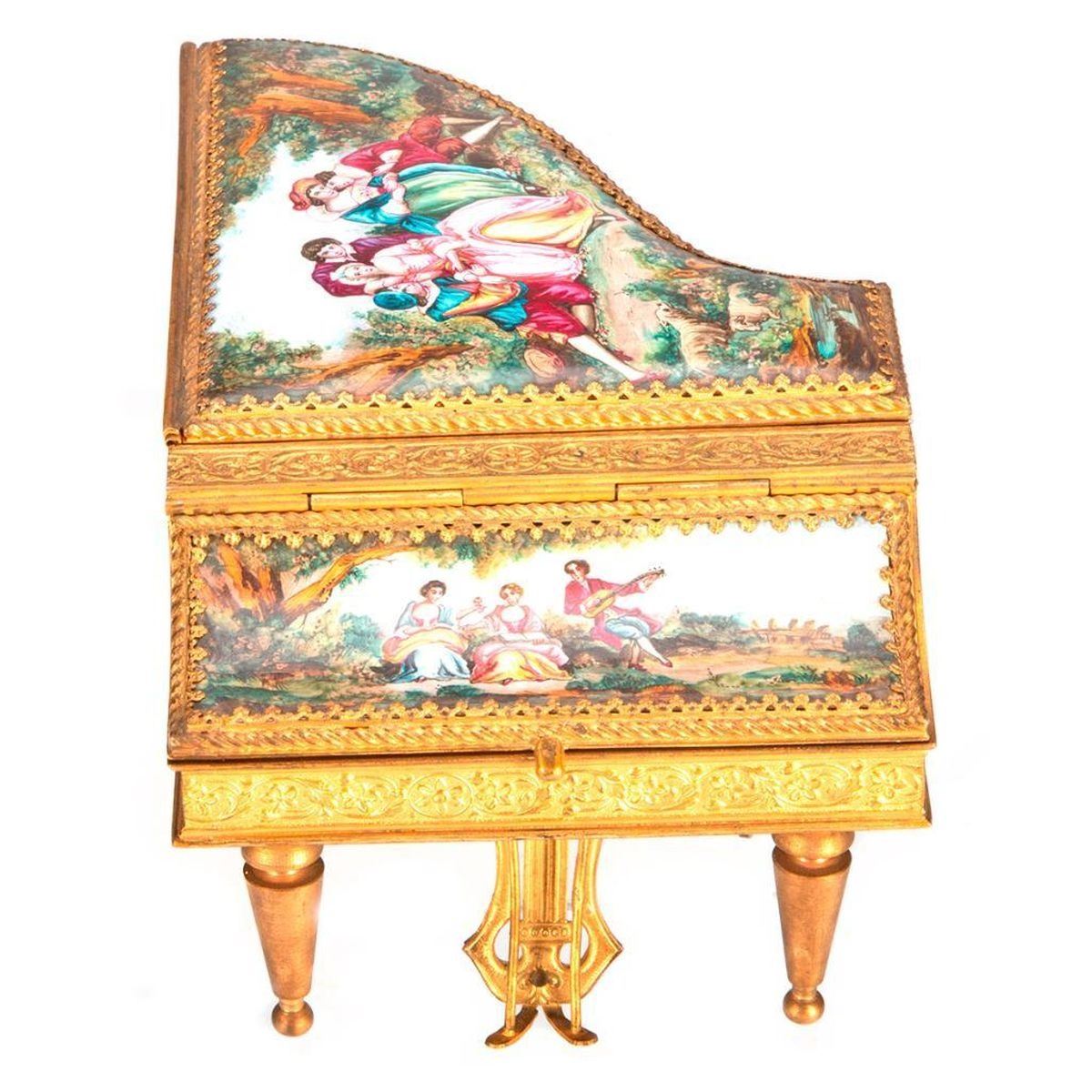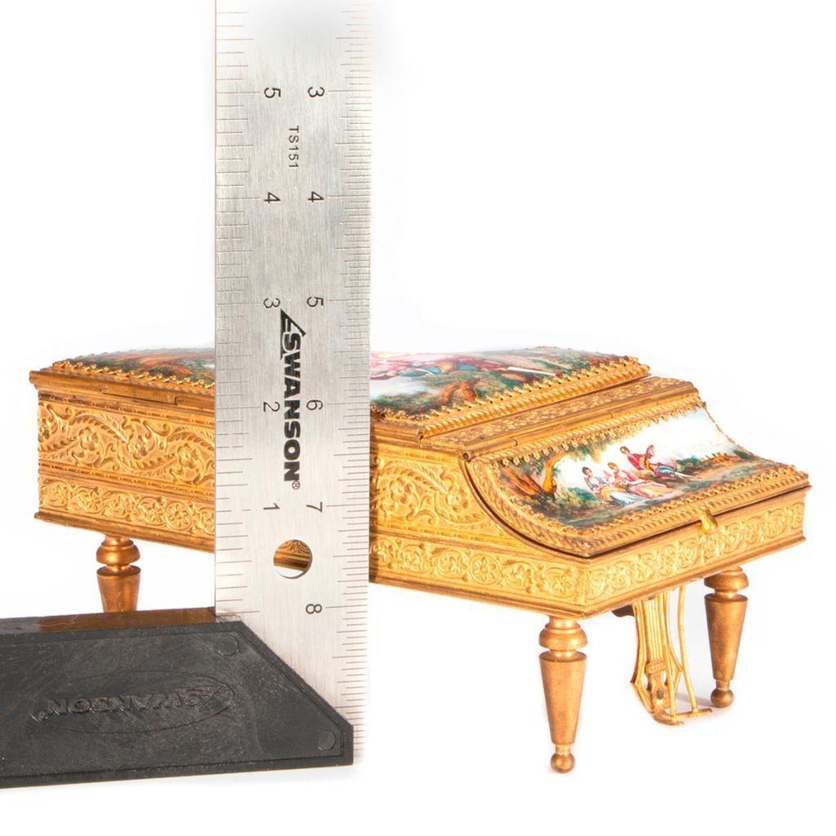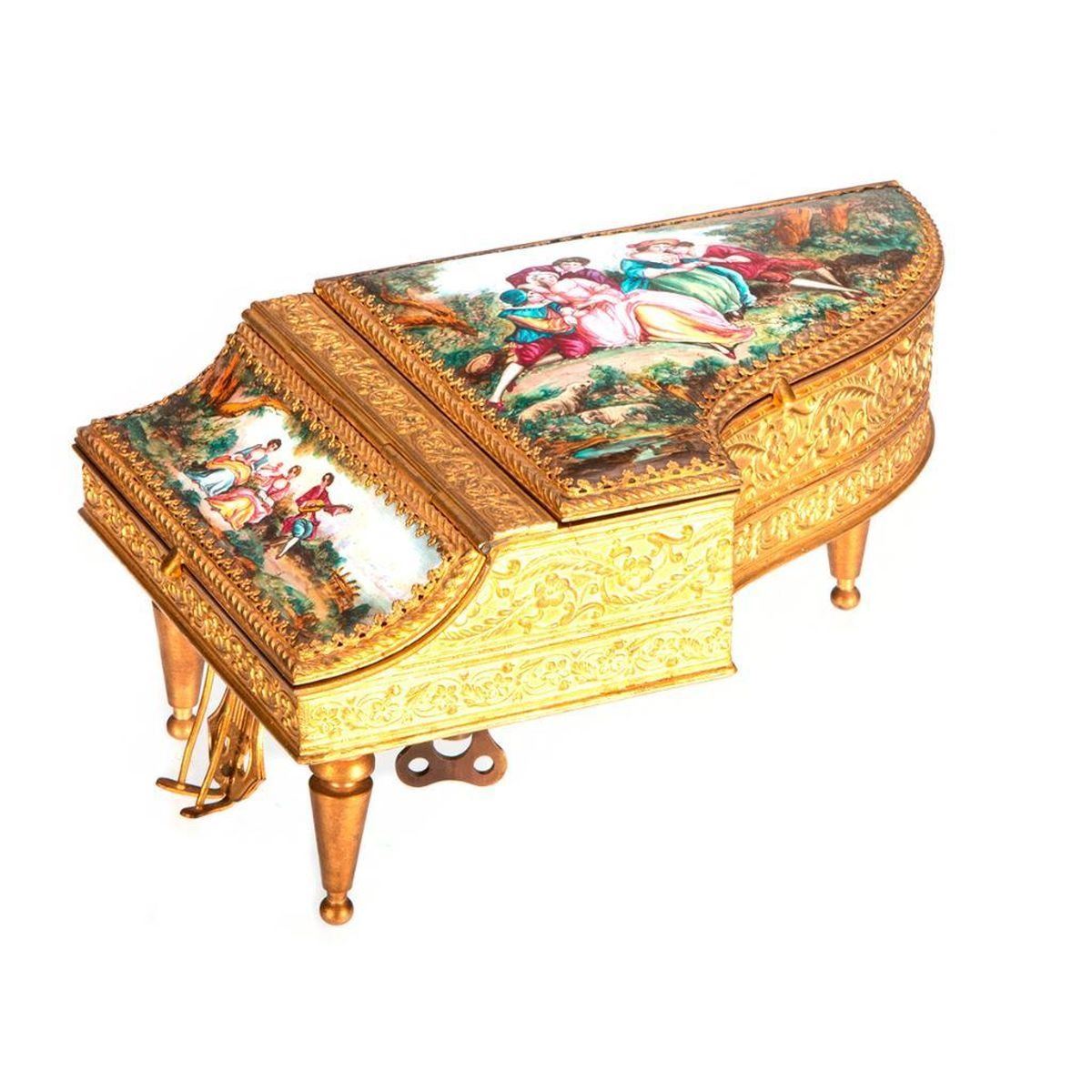 Music Box Piano fitted as a jewlery case, painted panels lift showing the key board and velvet lined interiort. Marked on the underside Made in Austria. H-3.5" W-7" D-4.25" Very Good, Music box not working