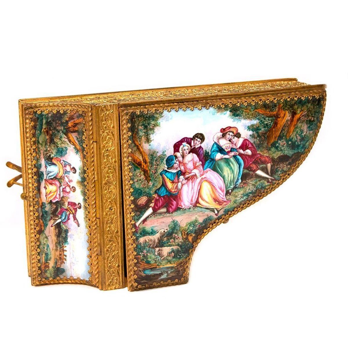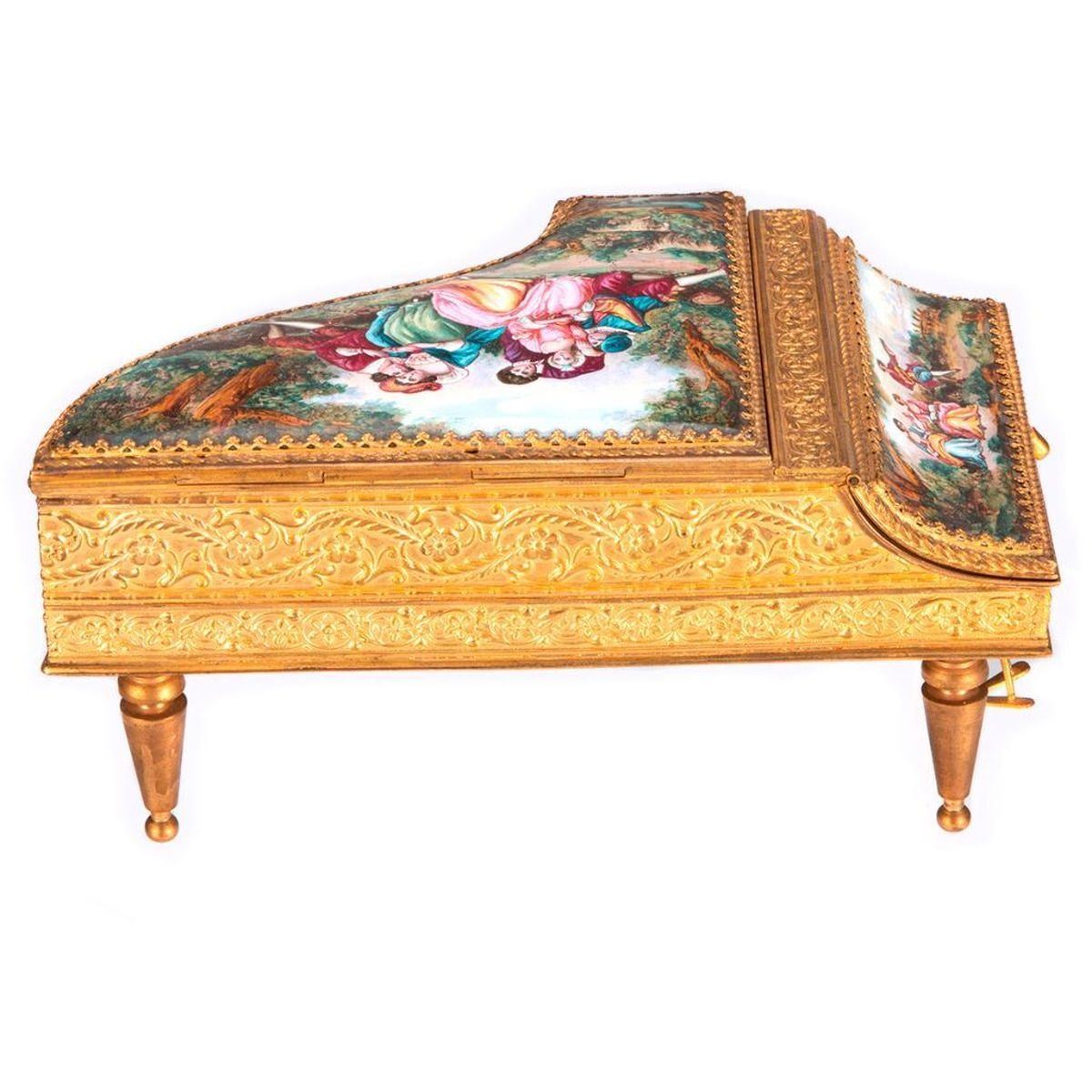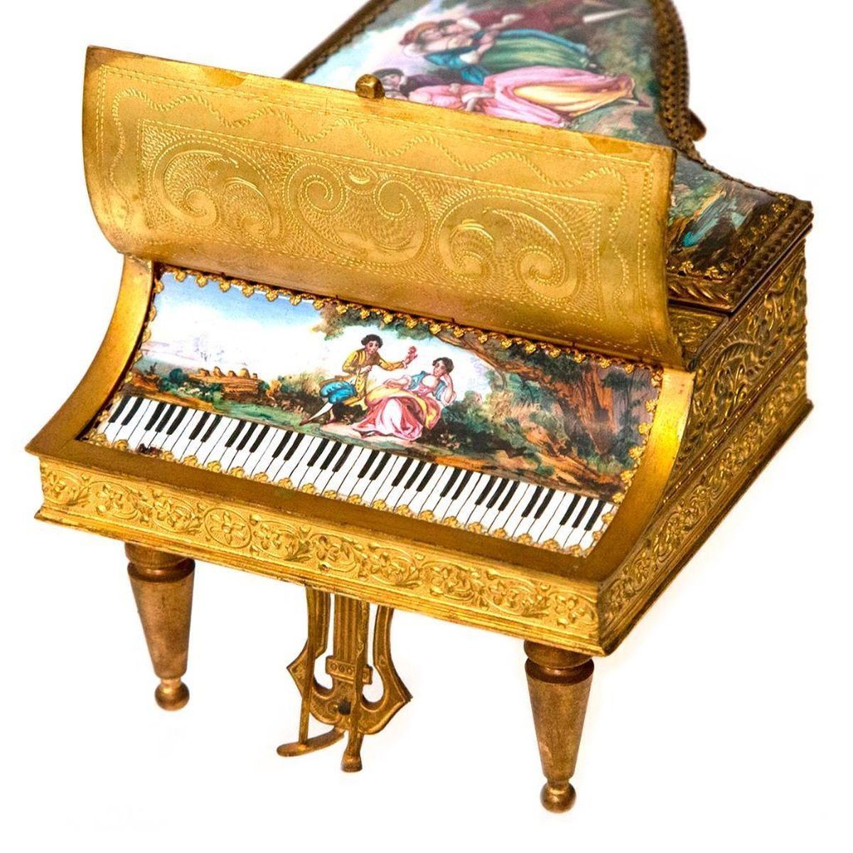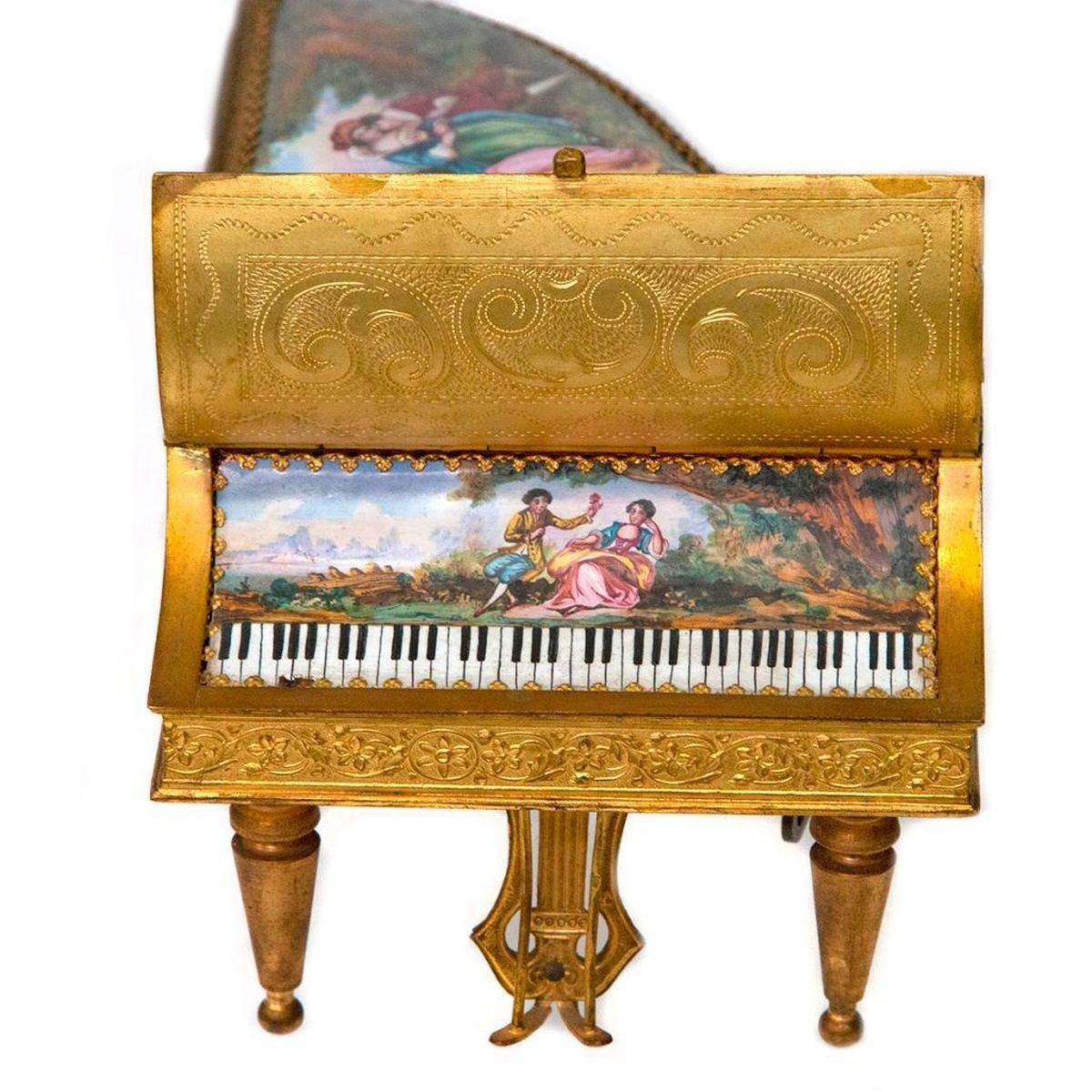 Music Box Piano fitted as a jewlery case, painted panels lift showing the key board and velvet lined interiort. Marked on the underside Made in Austria. H-3.5" W-7" D-4.25" Very Good, Music box not working