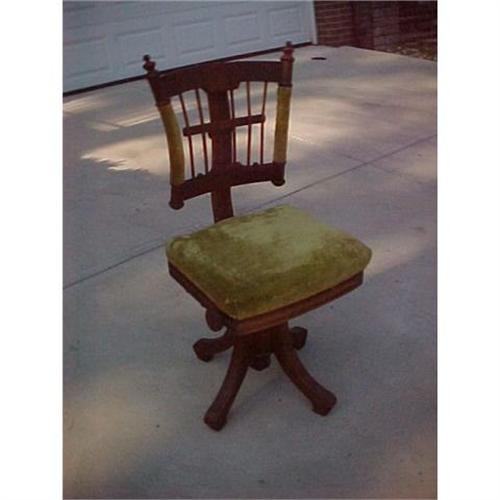 This is the most unique chair that we found at a local auction in a once affluent neighborhood in the Burg. The base is similar to Louis XVI style piano stools however there is a mechanical apparatus that connects the base to the chair. The mechanical apparatus may be Hunzinger however we cannot find any markings. There is an arch back that resembles a music stand. There are two adjustments to the chair - one on the seat and the other behind the back. There are reeds straight up and down on the back and one has been glued and a second is fragile. The seat swivels all the way around in a complete 360 degree rotation. The upholstery is a green velvet and even the two uprights are upholstered in the velvet. This was probably a piano or organ stool - possibly a chair in a symphony orchestra or for a string quartet. We wish we could give you more details on the maker and date - it seems to date to sometime in the 1800s but that is as much information as we have on this great chair. It stands about 35 inches tall as found and possibly would adjust upward by using the adjustments and mechanisms.