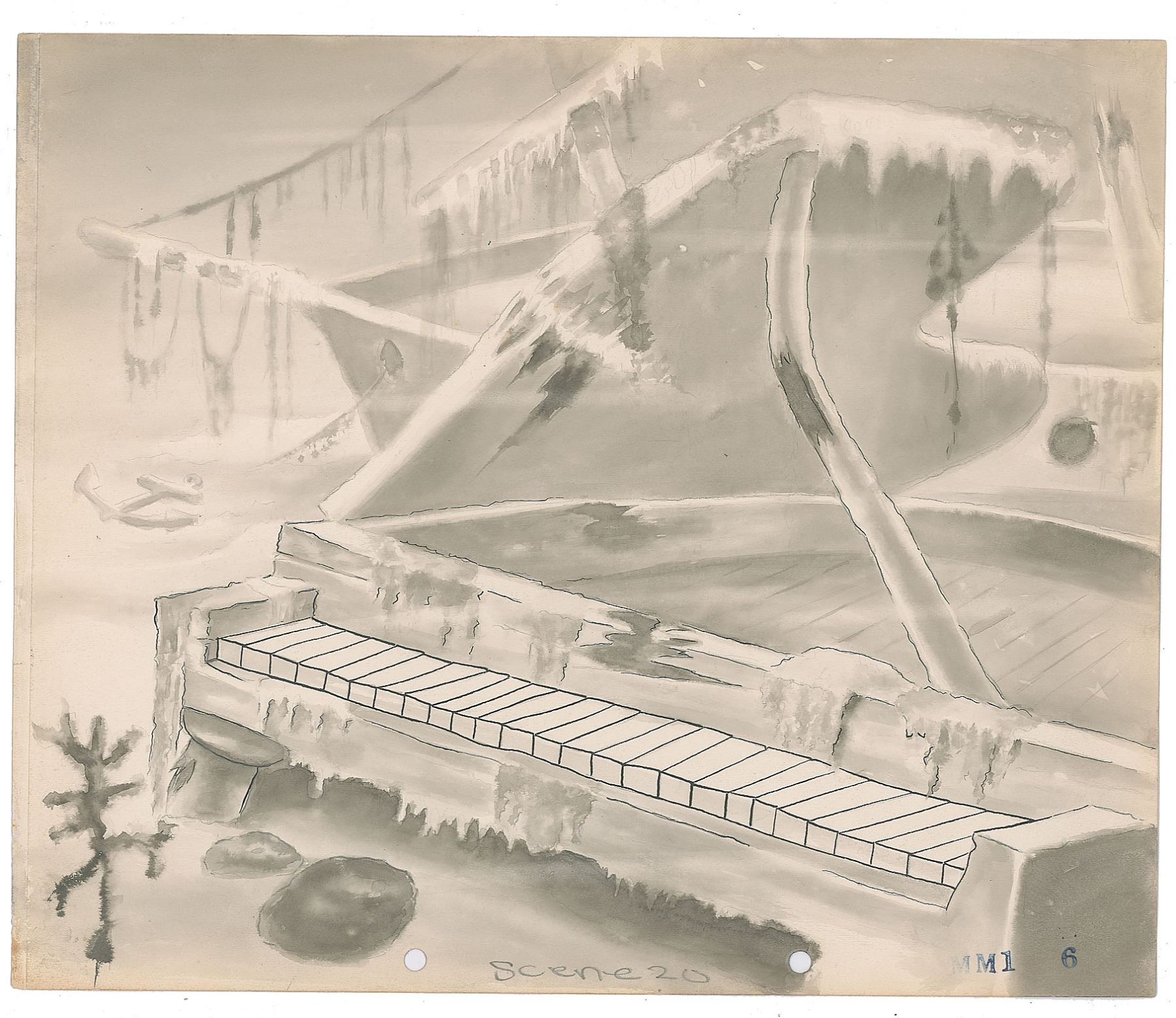 (Warner Brothers Studios, 1932) Original production background featuring the underwater piano from Pagan Moon. In the Merrie Melodies short, a native island boy sings 'Pagan Moon' to his sweetheart, playing various instruments alongside animal friends before eventually diving into the ocean to find the submerged piano. Accomplished in pen and ink on a 12 x 10 sheet, marked "Scene 20" along the bottom and stamped "MM1 6" in the lower right. In fine condition.