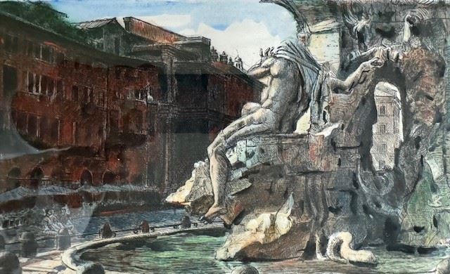 A Unique hand-painted acrylic over limited edition etching by renown Milan artist Ernesto Ornati (1988), 8x4.5" on 20x14" paper, framed to 23x18.5". A nick in corner of frame.