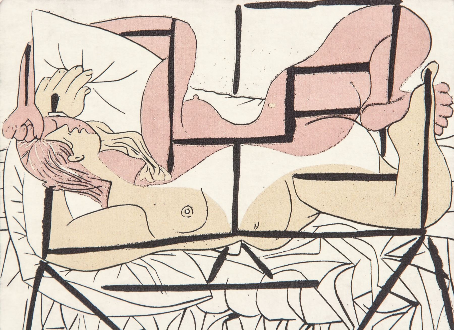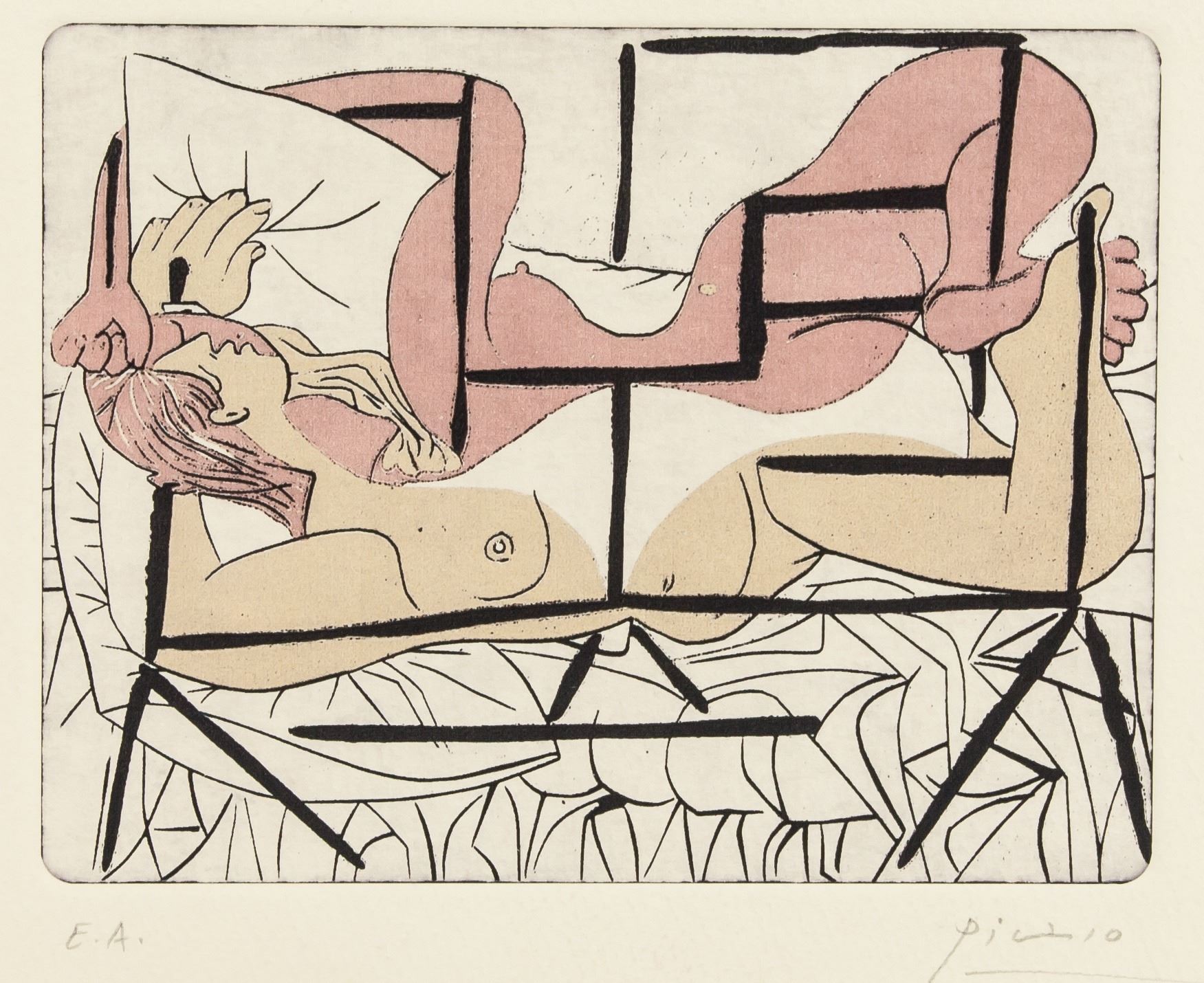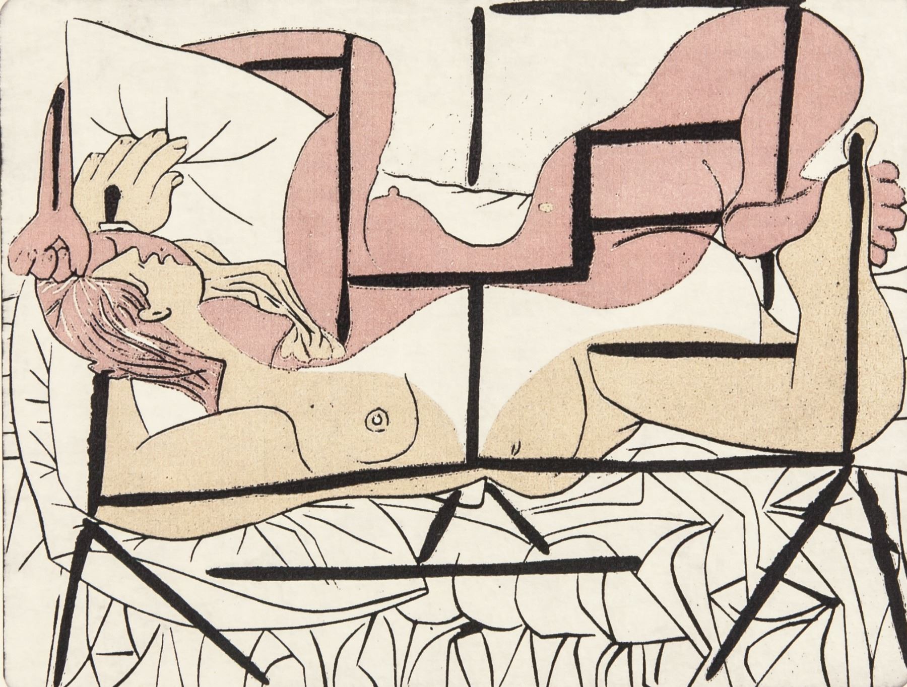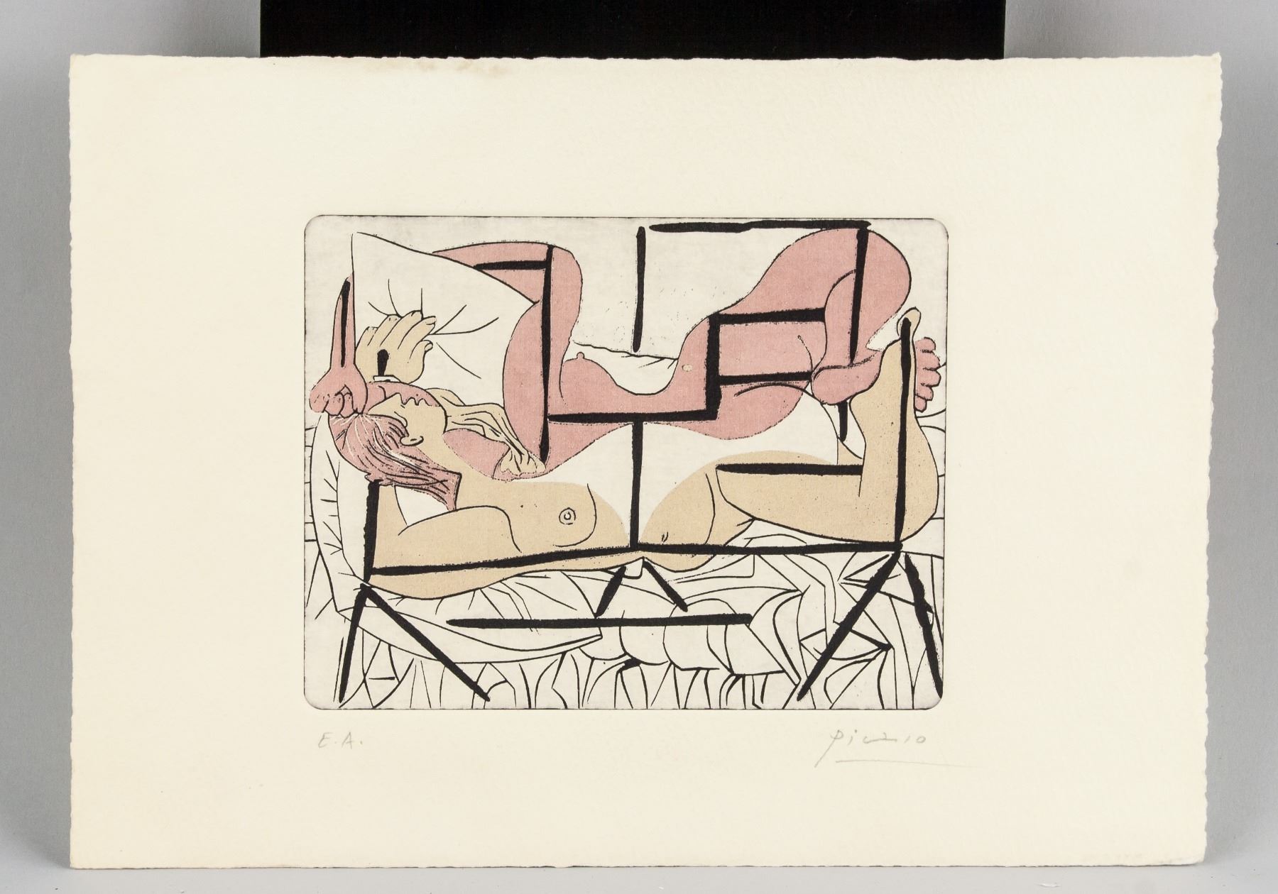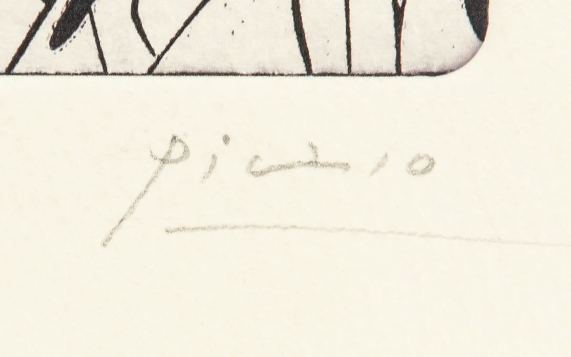 Print on paper, featuring reclining nude. Signed and attr. Pablo Picasso (Spanish, 1881-1973) on bottom right corner. 8.25 x 11.75 inch (21.0 x 29.9 cm). A prolific and tireless innovator of art forms, Pablo Picasso impacted the course of 20th-century art with unparalleled magnitude. Inspired by African and Iberian art and developments in the world around him, Picasso contributed significantly to a number of artistic movements, notably Cubism, Surrealism, Neoclassicism, and Expressionism. Along with Georges Braque, Picasso is best known for pioneering Cubism in an attempt to reconcile three-dimensional space with the two-dimensional picture plane, once asking, “Are we to paint what’s on the face, what’s inside the face, or what’s behind it?” Responding to the Spanish Civil War, he painted his most famous work, Guernica (1937), whose violent images of anguished figures rendered in grisaille made it a definitive work of anti-war art. “Painting is not made to decorate apartments,” he said. “It’s an offensive and defensive weapon against the enemy.” Picasso’s sizable oeuvre includes over 20,000 paintings, prints, drawings, sculptures, ceramics, theater sets, and costume designs. PROVENANCE: Private collection, Toronto, ON
