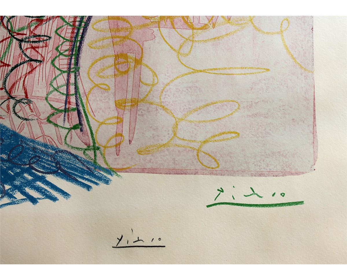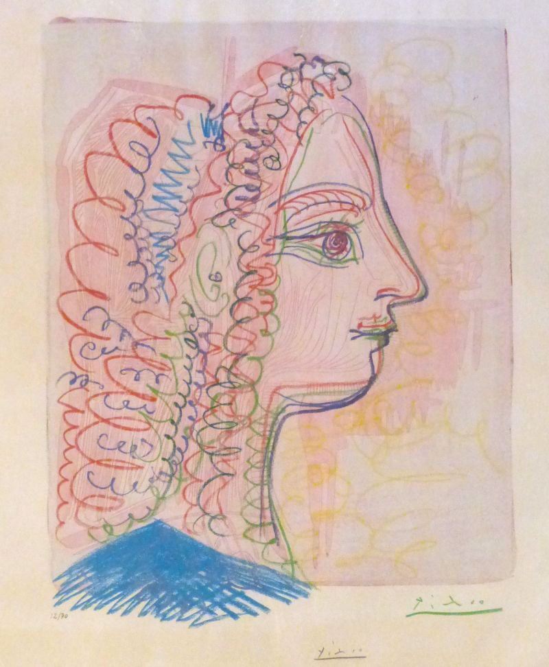 Pablo Picasso. "Profil Feminin" (Aeitgenossische Malerie aus den waadtlandischen Sammlungen, 1971). Color Lithograph signed in pencil in the lower right, also signed in the stone, lower right. Numbered 12/70 in the lower left as well as an edition stamp on verso. Condition is excellent. Can be referenced by Czwiklitzer Catalog Raisonne no. 387. Image size 15 5/8 x 20 3/8 inches, sheet size 22 x 30 inches. Published for the exhibition at the Musee des Arts Decoratifs in Lausanne, France that ran from 1/16/1971 - 2/07/1971. Accompanied by a Certificate of Authenticity.