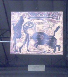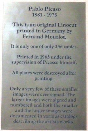 Picasso "Banderillas" Linocut This is an original Linocut printed in Germany by Fernand Mourlot. It is one of only 256 copies. Printed in 1963 under the supervision of Picasso himself. All plates were destroyed after printing. Only a very few of these smaller images were ever signed. The larger images were signed and numbered and both the smaller and the larger images were documented in various catalogs describing the artist's work.
