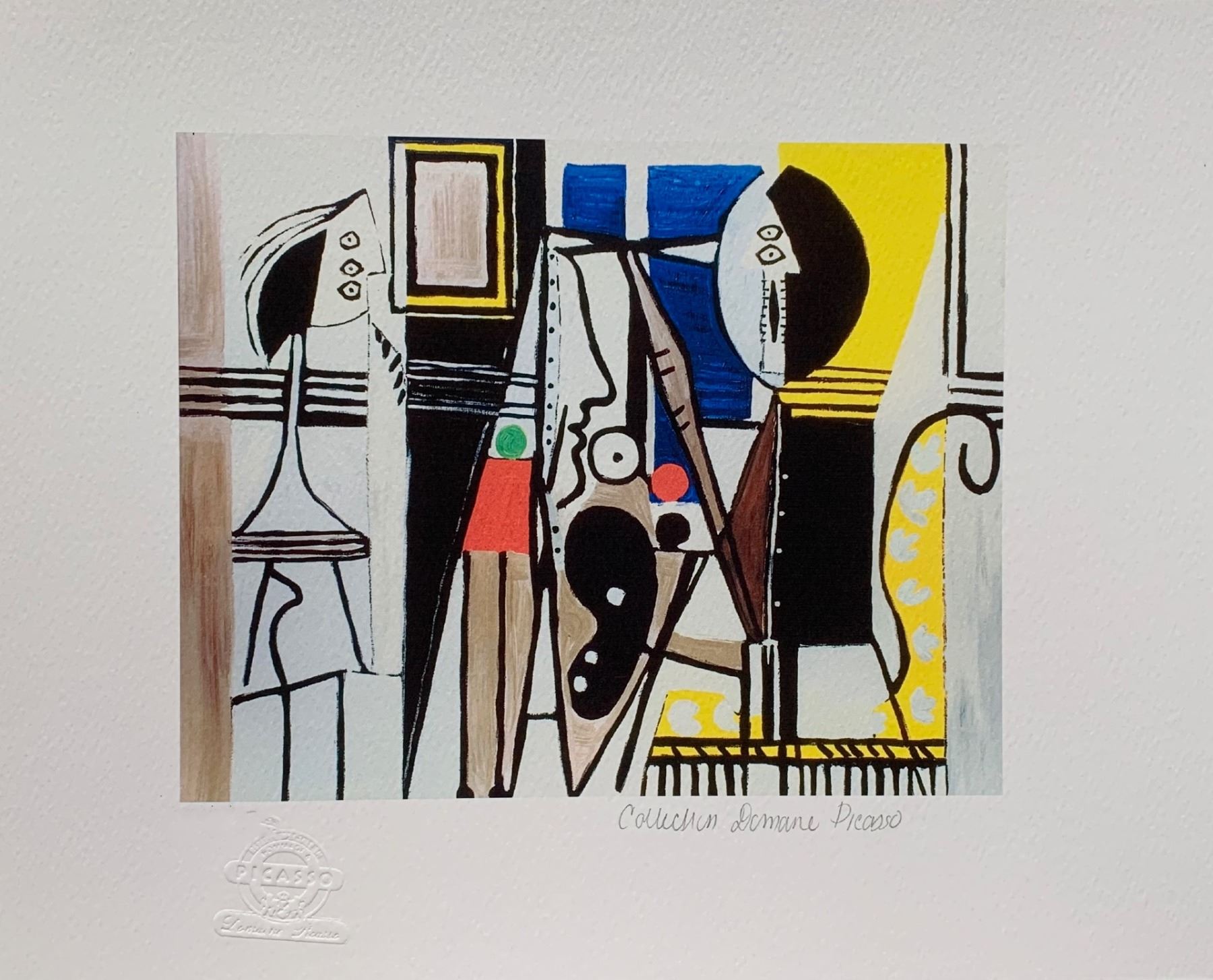 This is a PABLO PICASSO (ESTATE COLLECTION DOMAINE) (1881-1973) giclee titled “PAINTER IN THE STUDIO”. This piece is pencil hand signed on the lower right as ‘Collection Domaine Picasso’ and has an embossed seal stamped by the Picasso Estate. Pencil numbered from an edition of 500. Published on thick quality archival paper. Paper with border measures 11? x 17?. Image measures 7.25? x 9?. In excellent condition, comes unframed. Comes with a certificate from the Picasso Domaine Collection.