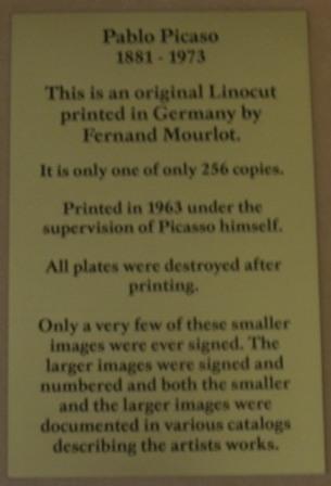 Picasso "Picador Goading Bull w/Matador" Linocut EXTREMELY RARE!!!! This is an original Linocut printed in Germany by Fernand Mourlot. It is one of only 256 copies. Printed in 1963 under the supervision of Picasso himself. All plates were destroyed after printing. Only a very few of these smaller images were ever signed. The larger images were signed and numbered and both the smaller and the larger images were documented in various catalogs describing the artist's work.