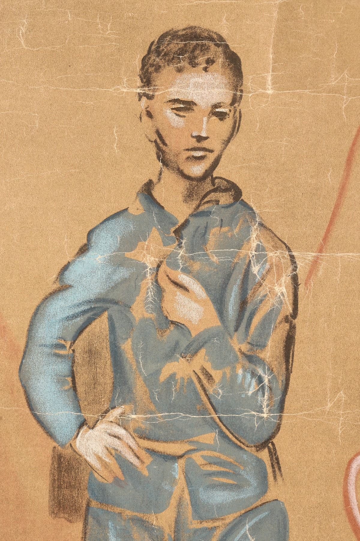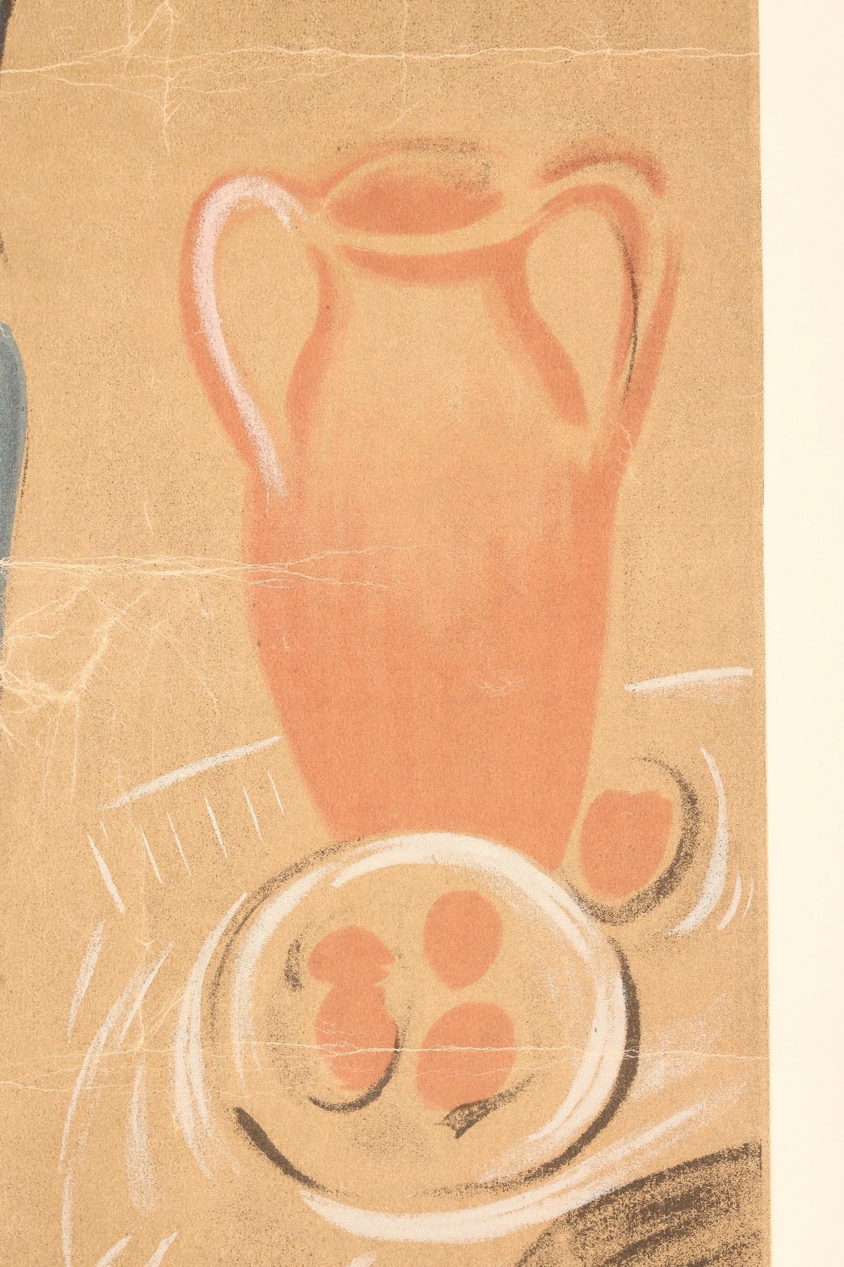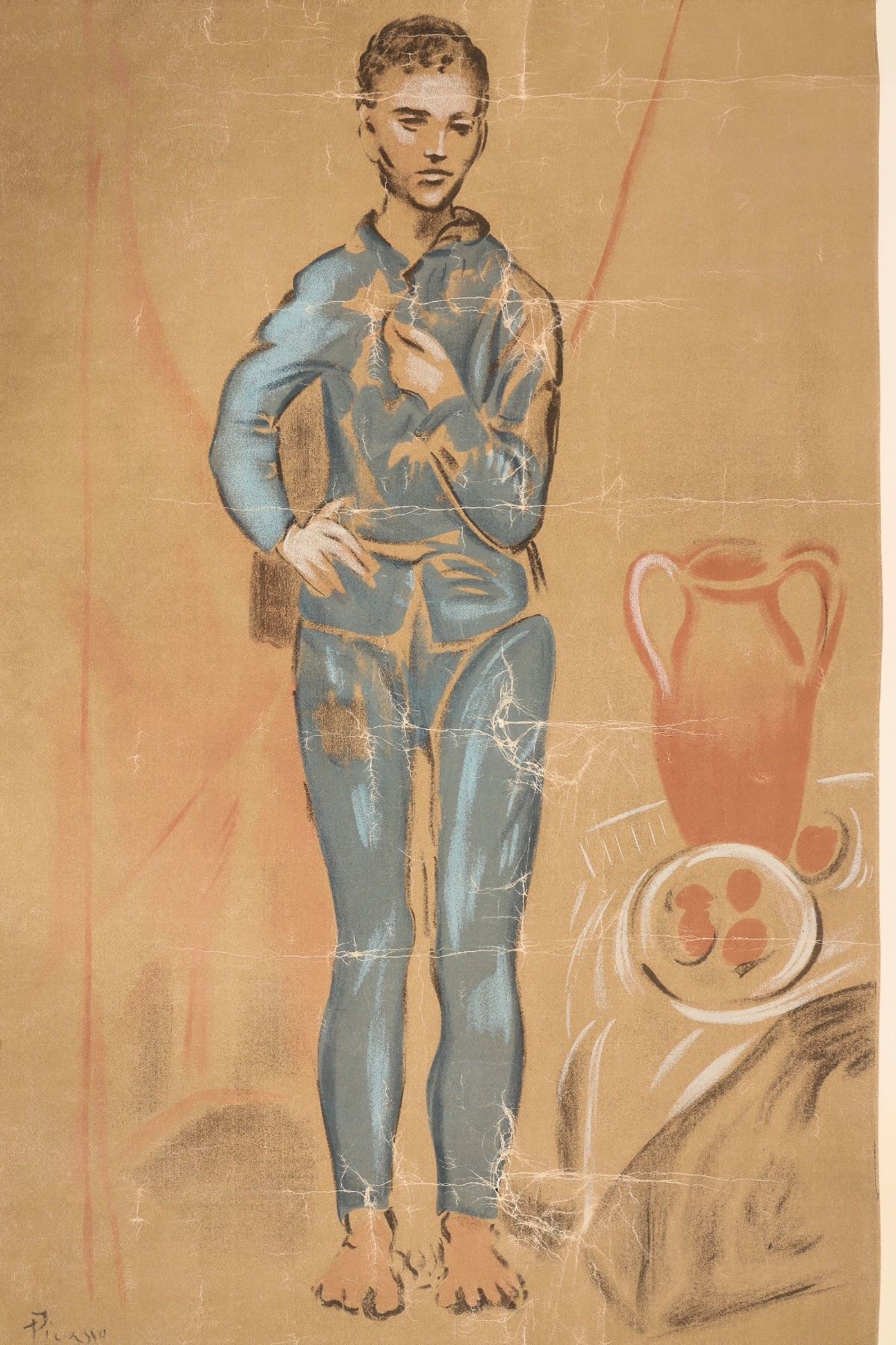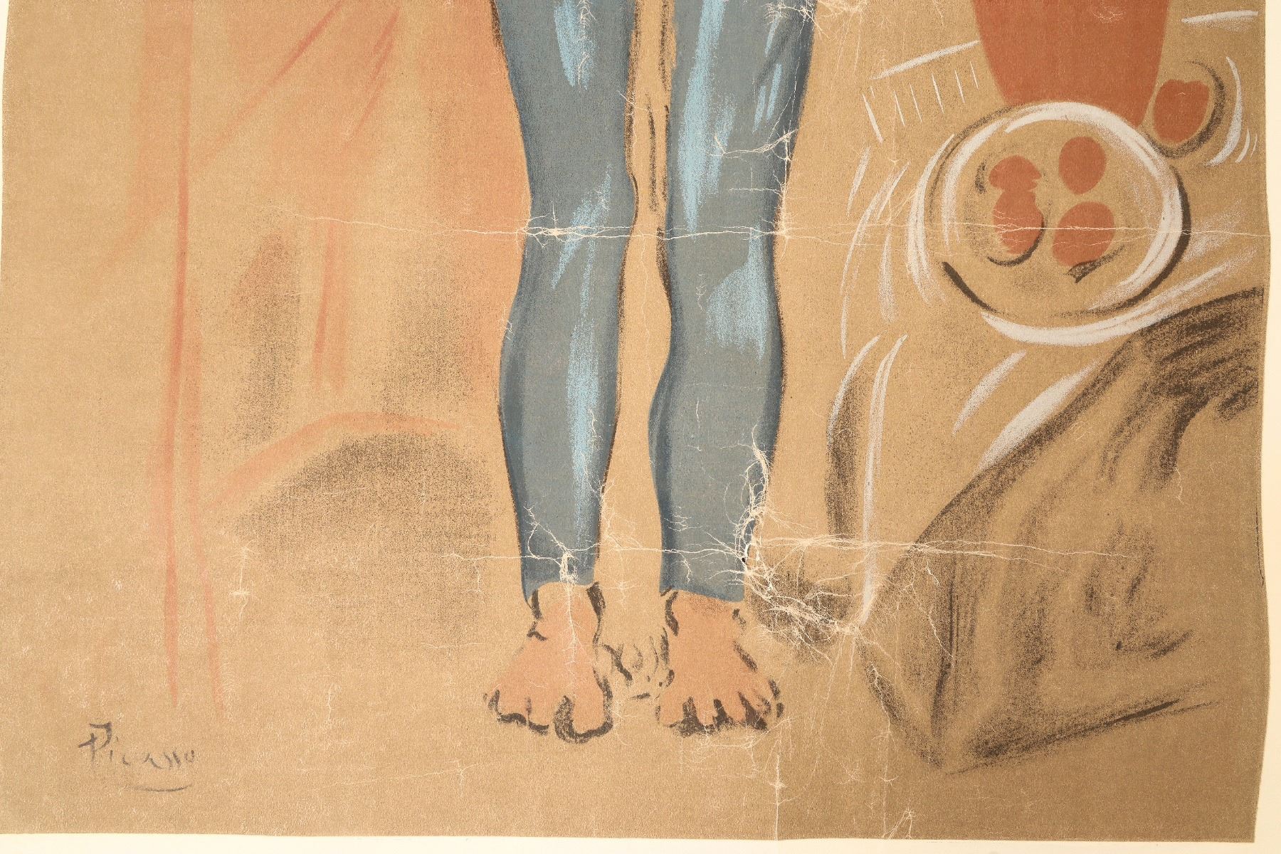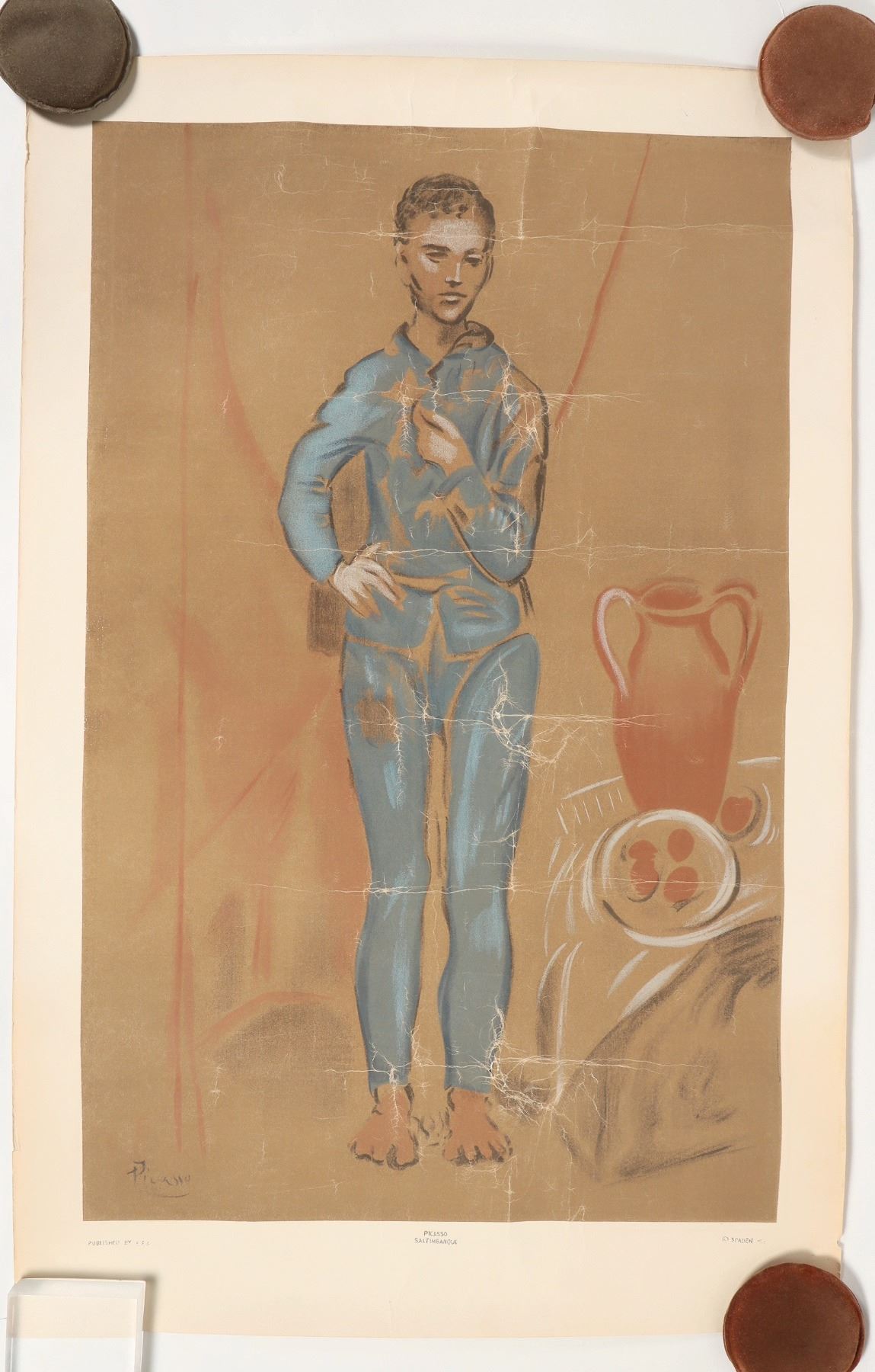Picasso's Saltimbanque Family Published by F.F.A c1950. .. 40 x 26 ". This is one character of the entire series. The original was painted in 1904 during Picasso's Rose Period and sometime referred to as his circus period and is of circus performers. The original is considered a Masterpiece of this period. Saltimbanque is a French term for a performer that moves from one fair to the next to provide an improv show.