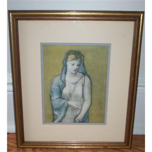 THIS IS AN ABSOLUTELY STUNNING PABLO PICASSO "WOMAN IN A BLUE VEIL" PRINT. IT IS SIGNED "PICASSO '23" ON THE TOP LEFT CORNER (SIGNATURE IS FACSIMILE) NONTHELESS, IT IS IN PRISTINE CONDITION AND HAS BEEN DOUBLE-MATTED AND FRAMED. IT ALSO HAS A UNIQUE COLOR SCHEME WHICH IS THAT THE ORIGINAL PIECE DONE BY PICASSO HAS A REDDISH BACKGROUND, WHEREAS THIS PRINT HAS A BEAUTIFUL OLIVE COLORED BACKGROUND. I CAN'T SAY EXACTLY WHEN THIS WAS PRODUCED OR SOLD, HOWEVER IT WAS ACQUIRED FROM A PROMINENT LOCAL POLITICIAN'S ESTATE, WHOSE OTHER ART WORKS WE HAVE FOR SALE, DOES IN SOME WAYS QUANTIFY A RELATIVELY HIGH STANDARD OF QUALITY TO THE COLLECTION. MEANING THIS PIECE WAS NOT PURCHASED OR SOLD AT OYUR LOCAL ART STORE OR MALL!