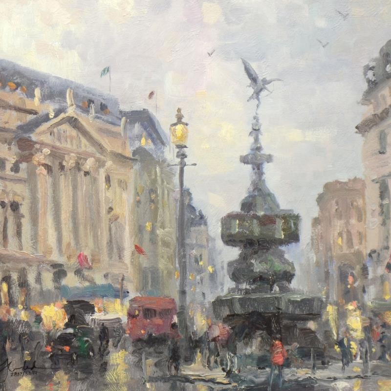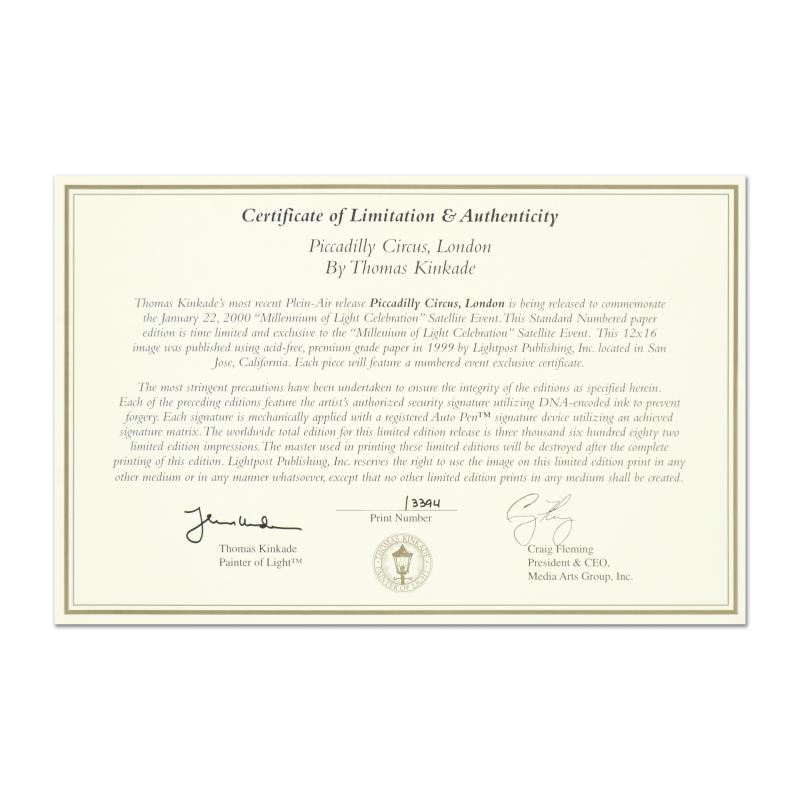 "Piccadilly Circus" is an Offset Lithograph on paper by Thomas Kinkade (1958-2012), numbered and bearing Kinkade's authorized signature. Includes Letter of Authenticity. Measures approx. 16" x 20" (border), 16" x 12" (image).