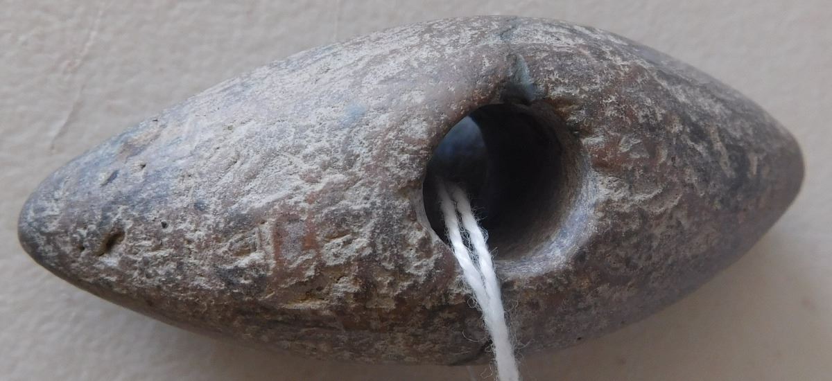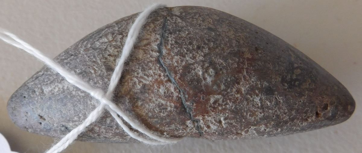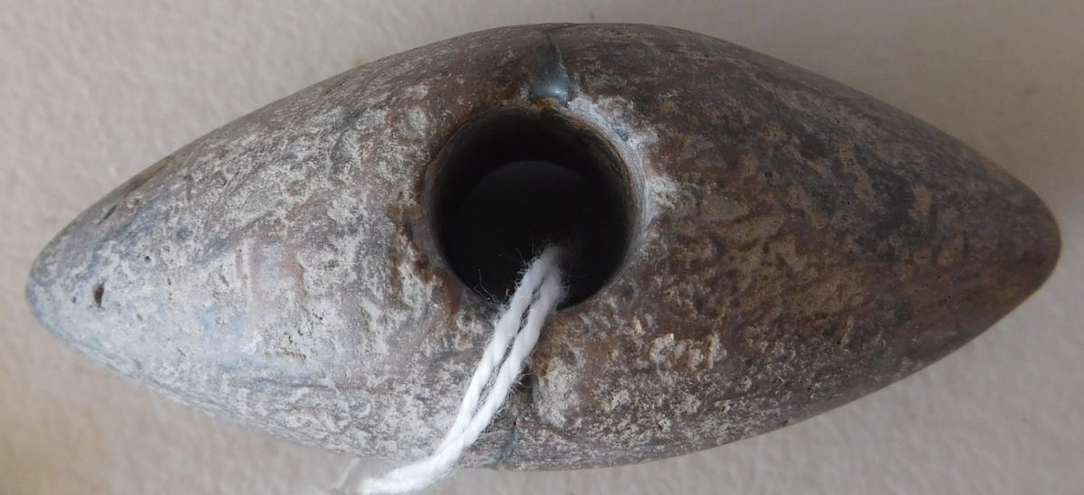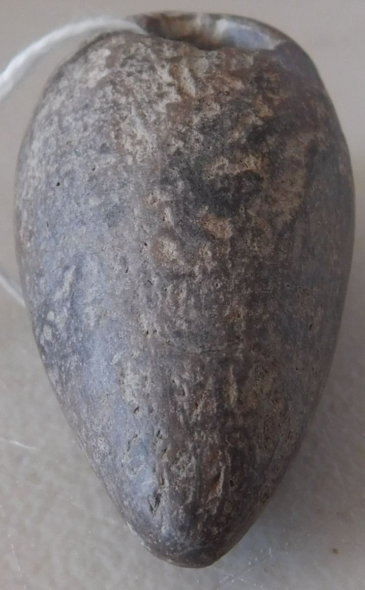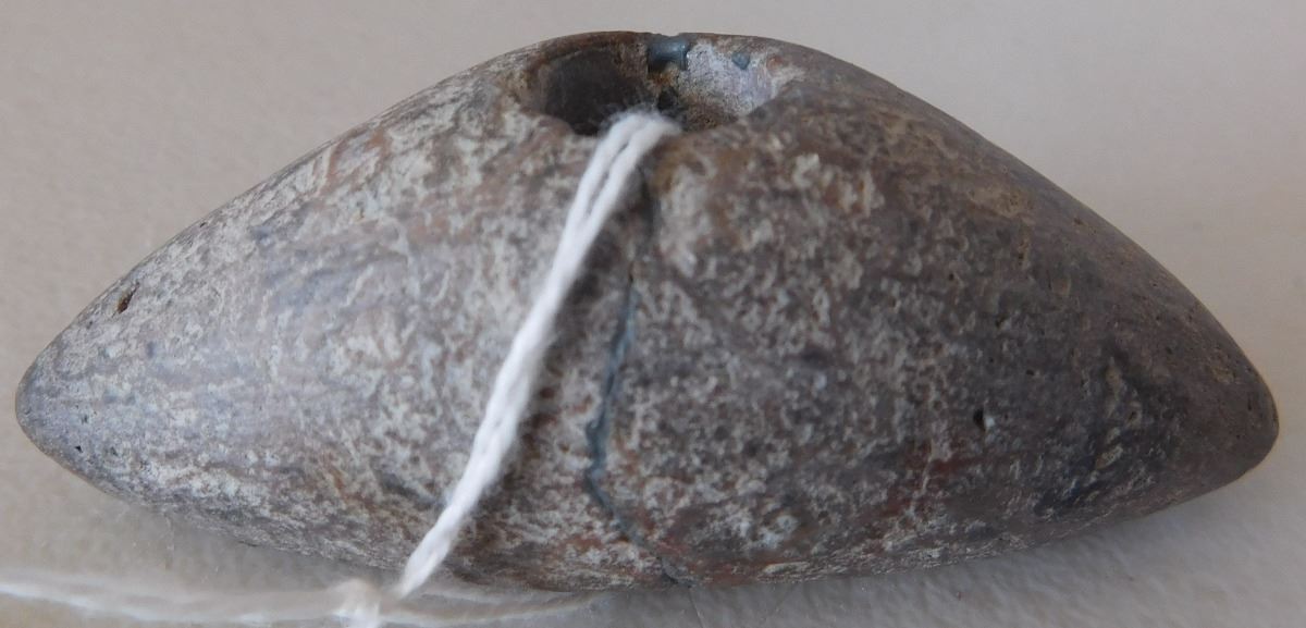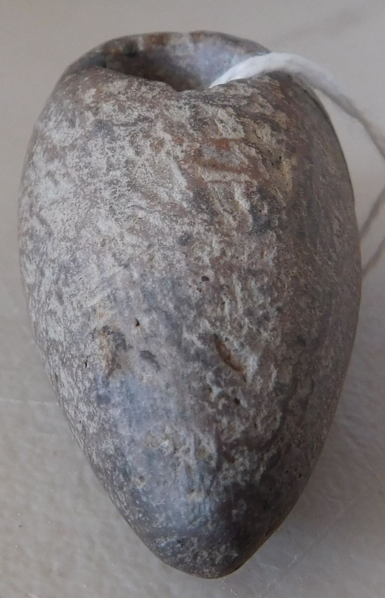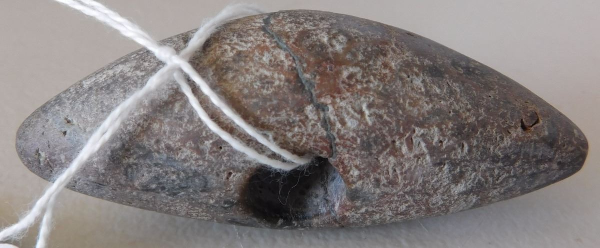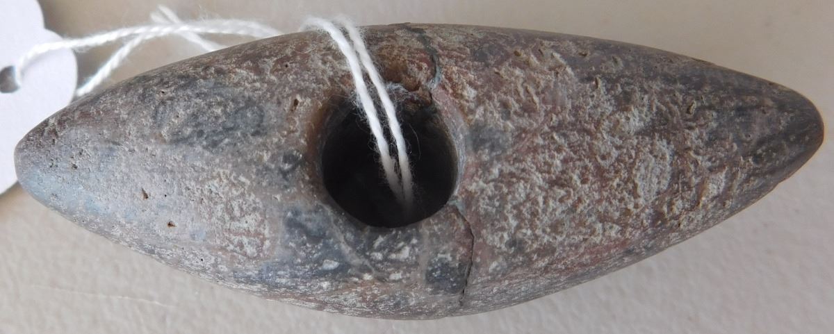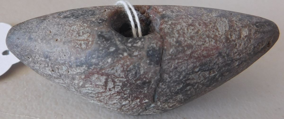 Pick-style Illinois Slate Bannerstone, pre-historic item. Made of slate and measuring 3" x 1" x 1". From Central Illinois. Condition: Crack near hole, see images. Shipping: $15.50.