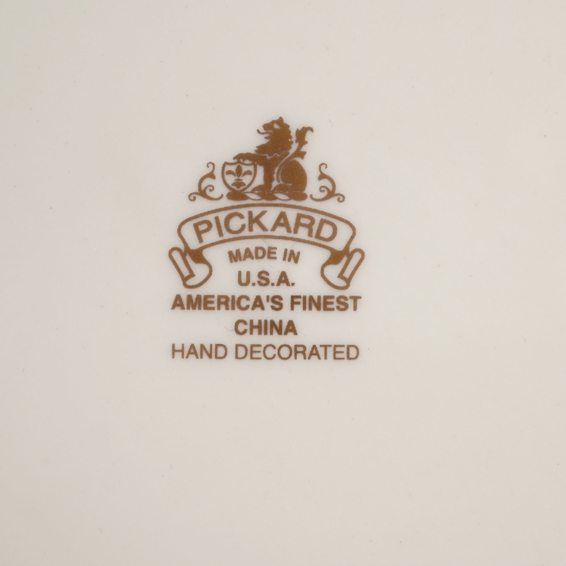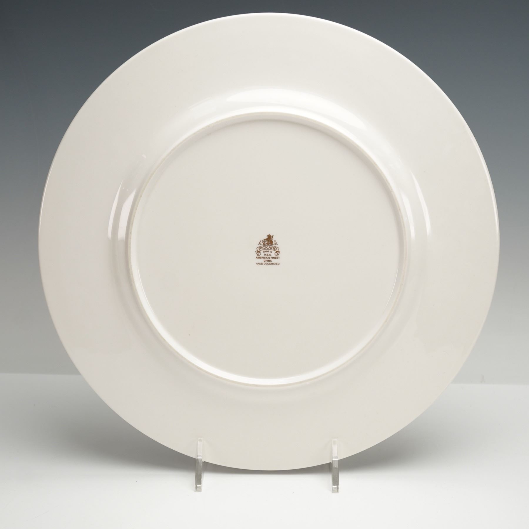 A round charger plate with a wide gilded border featuring an irregular textured pattern in gold and white. The center is smooth and white, creating a clear contrast with the metallic rim. Pickard backstamp.