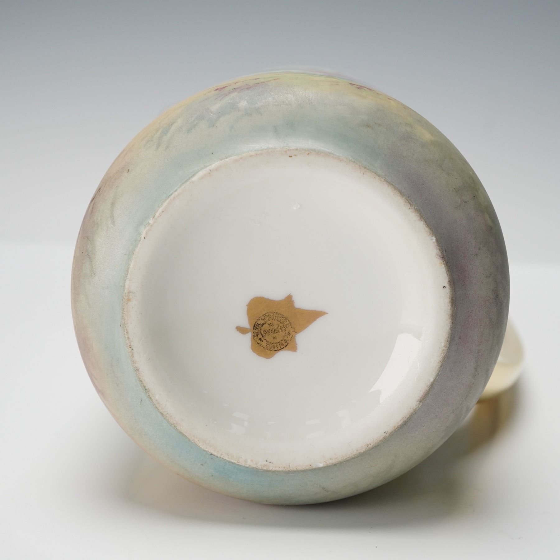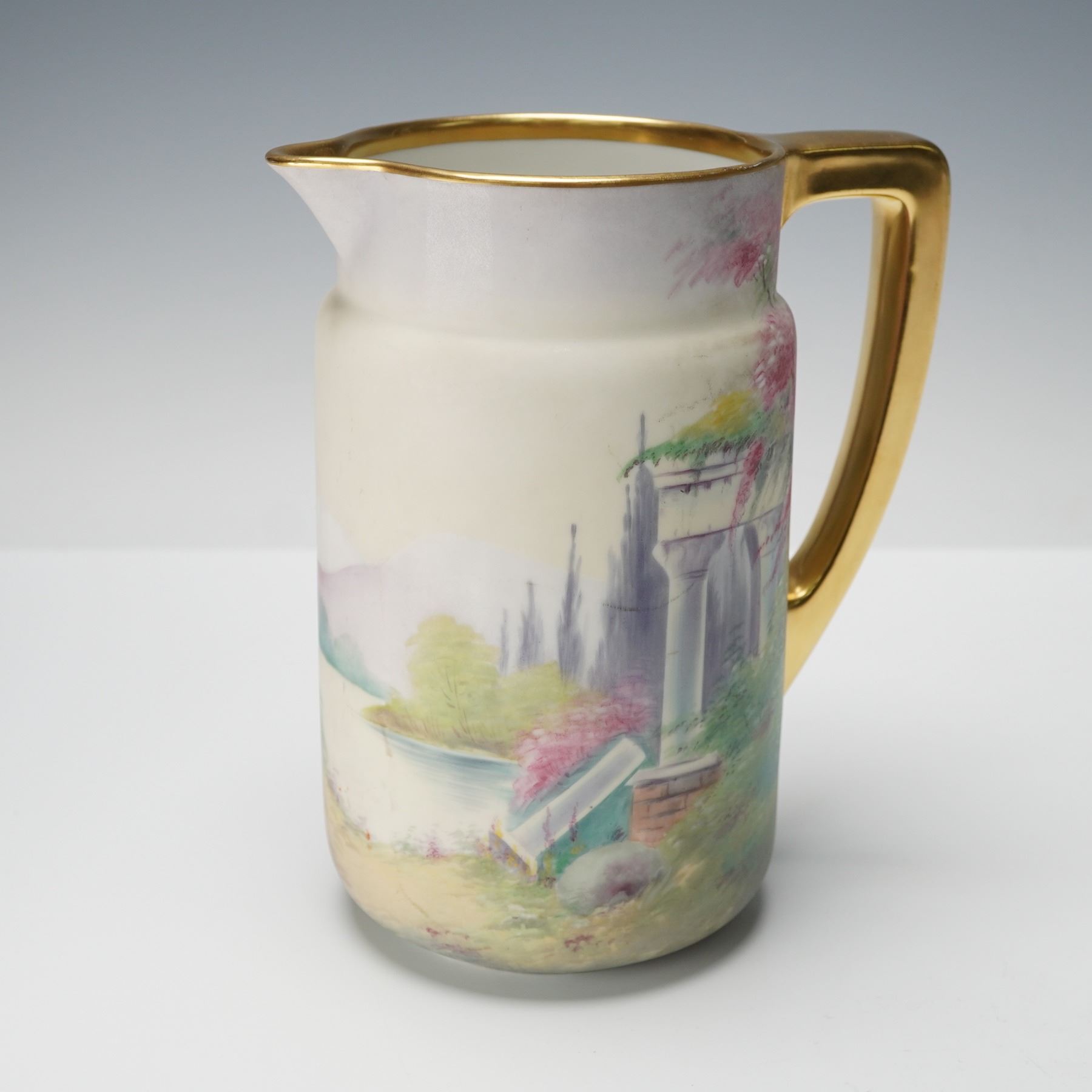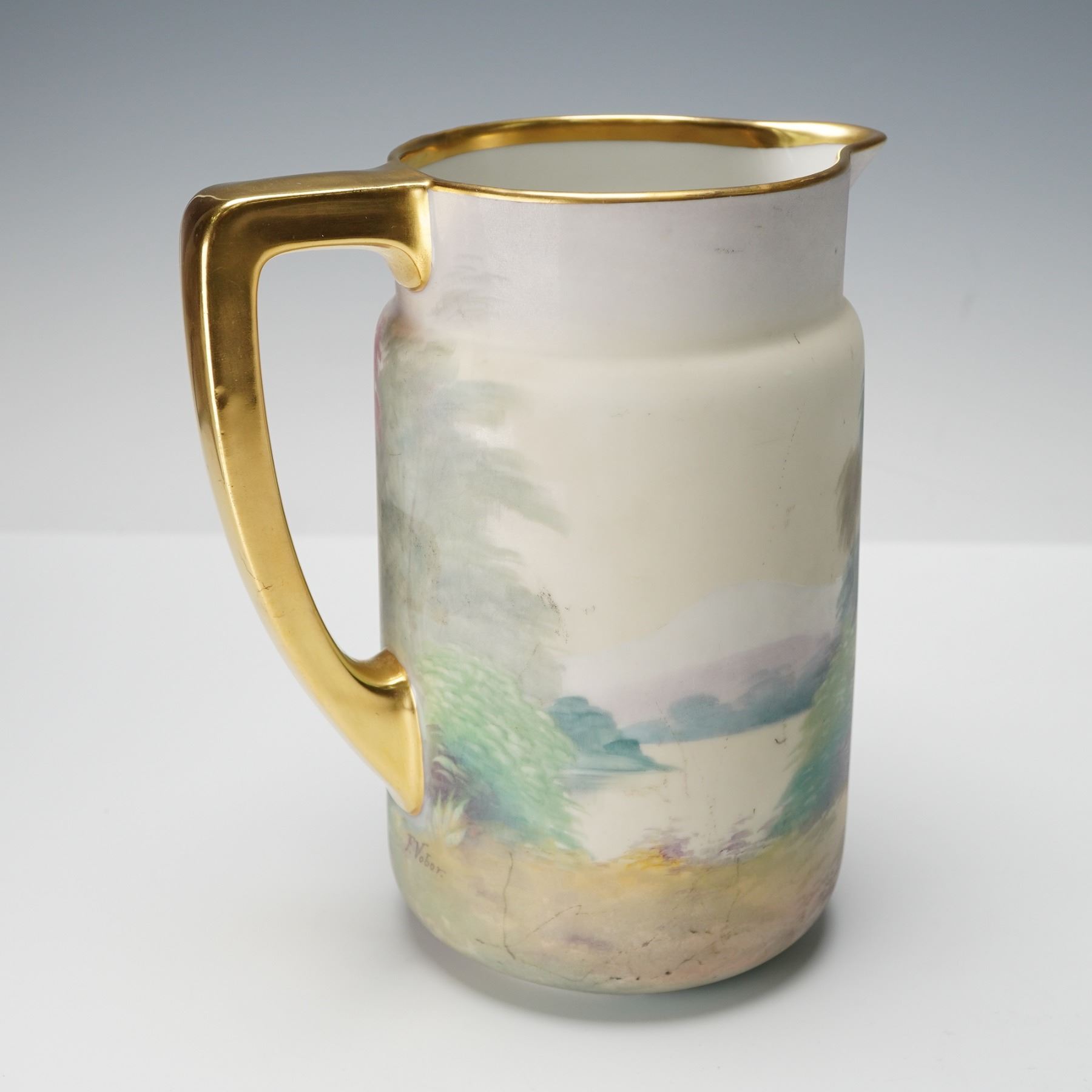 This porcelain pitcher features hand-painted landscape decoration signed F. Vobor, showing water, foliage, mountains, and architectural elements extending around the body. The handle and rim are finished in gilt. The form includes a defined shoulder and wide spout. The underside features the Pickard mark.