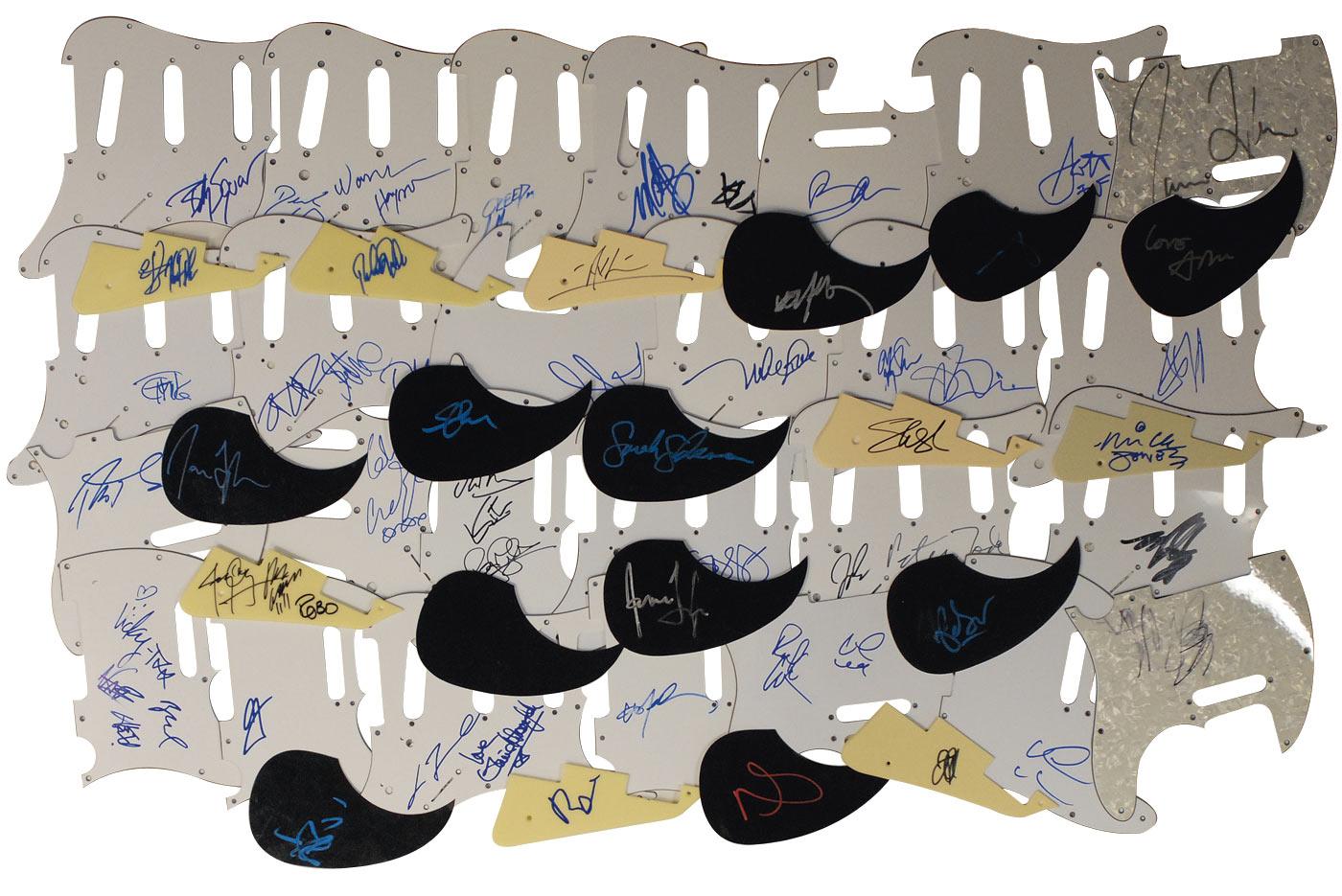 Forty-seven pickguards, for various models of electric and acoustic guitars, each signed in ink or felt tip by different musicians. Signers include: Billy Squire, Miley Cyrus, Derek Trucks and Warren Haynes, Ray Davies, Scott Stapp, Mark Hoppus and Travis Barker, Bono, James Taylor, James Taylor, Pete Wentz, Scott Shriner, Slash, Snoop Dogg, Sarah Silverman, Stefan Lessard, John Frusciante, Micky Dolenz & Peter Tork, Mark Hoppus, Cobra Starship by 4, James Taylor, Amy Mann, A.J. Mclean, Matisyahu, John Travolta and Olivia Newton-John, Axl Rose, Willie Nelson, Willie Nelson, Steven Van Zandt, Michael Buble, James Taylor, Misfits by 3, Tommy Chong, Rage Against the Machine by 3, Alex Turner, Mike Love, Joe Satriani, Mick Jones, Steven Tyler, Rob Thomas, Adele Adkins, Deep Purple by 3, Earth Wind & Fire by 2, Verdine White, Stone Temple Pilots by 2, Los Lonely Boys by 2, Robert Deleo, and Rick Nielsen. In fine overall condition. Oversized.