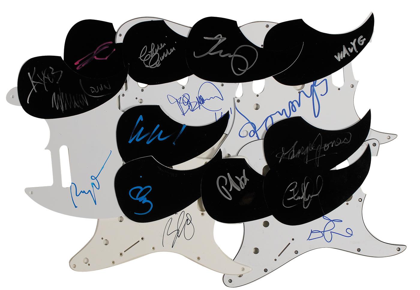 Fifteen pick guards for various models of electric and acoustic guitars, each signed in ink or felt tip by a different musician(s). Signers are: Brooks and Dunn, Peter Buck (REM), Chris Carrabba (Dashboard Confessional), Cherie Currie (The Runaways), Charlie Daniels, Wavy Gravy, George Jones, John Mellencamp, Lou Reed, Shania Twain, Ray Davies, Elvis Costello, Biz Markie, Shane MacGowan (The Pogues), and Brad Paisley. In fine condition, with scattered light surface wear and light brushing to a couple of signatures.