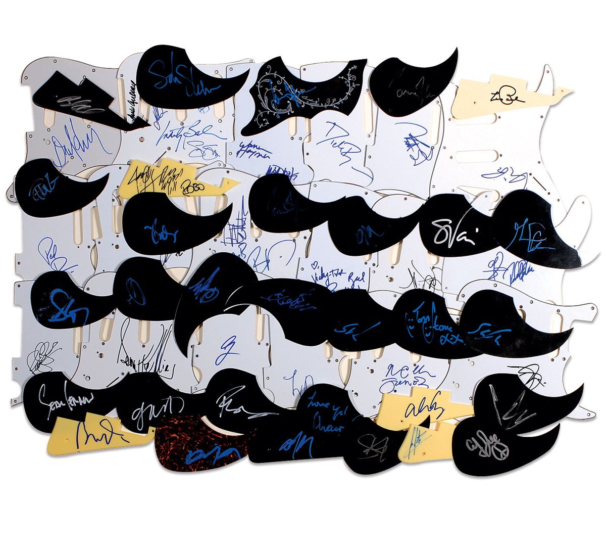 Fifty pickguards for various models of electric and acoustic guitars, each signed in ink or felt tip by a different musician(s) or celebrity. Included: Joe Satriani, Stefan Lessard (2), Joss Stone, Sean Lennon, Gavin Rossdale, Rob Thomas, Sharon Jones, Mick Jones, Alice Cooper, Chris Cornell, Ray Davies, Willie Nelson (3), Steven Tyler (2), Country Joe McDonald, Pete Wentz, Scott Stapp, Todd Rundgren, Mark Hoppus, Adam Levine, Paul Di’Anno, Billy Ray Cyrus, Kevin Bacon, Brad Arnold, three members of The Misfits, Tommy Chong, Lindsey Buckingham, Les Paul, James Taylor (3), Sarah Silverman, A.J. McLean, Sonny Rollins, Roger Glover, two members of Stone Temple Pilots, Steve Vai, Gavin DeGraw, Steven Tyler, Tyson Ritter, four members of Cobra Starship, Dave Matthews and Boyd Tinsley, Gov't Mule, Woodstock performers (Stephen Stills, Leslie West, Country Joe Mcdonald, Arlo Guthrie, Jorma Kaukonen, Marty Balin and Corky Lang), Travis Meeks, Dierks Bentley, and Derek Smalls. In fine overall condition.