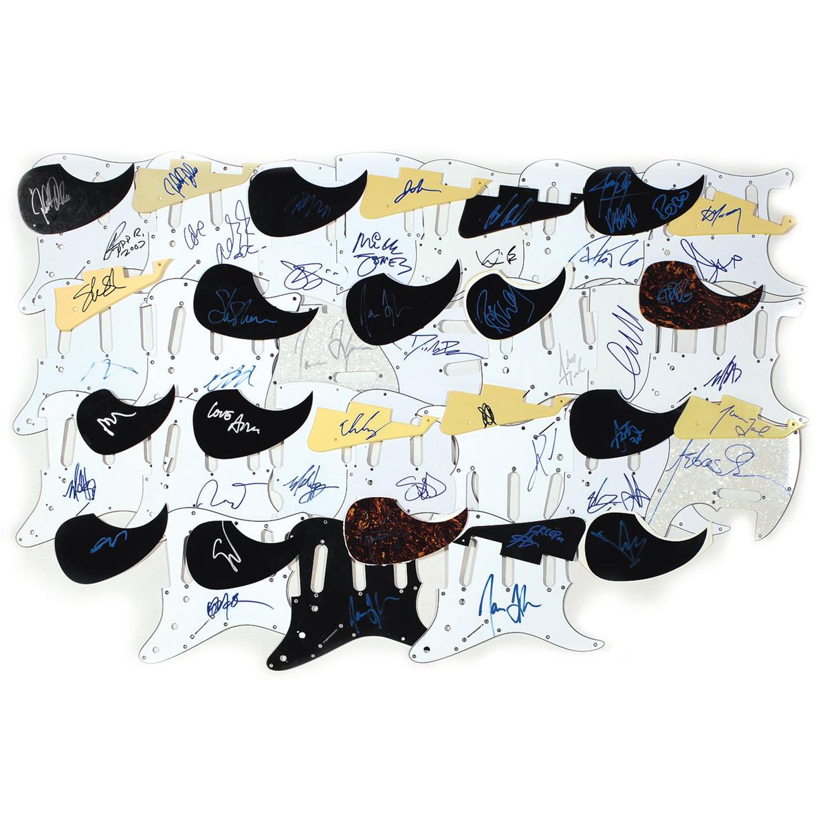 Thirty-seven pickguards, for various models of electric and acoustic guitars, each signed in ink or felt tip by a different musician(s). Included: Chris Cornell, Todd Rundgren, Willie Nelson, Joe Satriani, Mick Jones, Kevin Bacon, Tommy Chong, three members of the Misfits, Brad Arnold, John Reznick, John Frusciante, Ray Davies, Mark Hoppus (2), Alice Cooper, Amy Mann, Billy Ray Cyrus (2), Snoop Dogg, Michael Buble, two members of Los Lonely Boys, Sebastian Bach, James Taylor (6), Willie Nelson, Adele Atkins, Scott Stapp, Steve Vai, Stefan Lessard, Robert Deleo (2), Rob Thomas, Alex Turner, Matisyahu, Ozzy Osbourne, John Rich, Neil Young, Sarah Silverman, Slash, Roger Waters, and Scott Shriner. In fine overall condition.