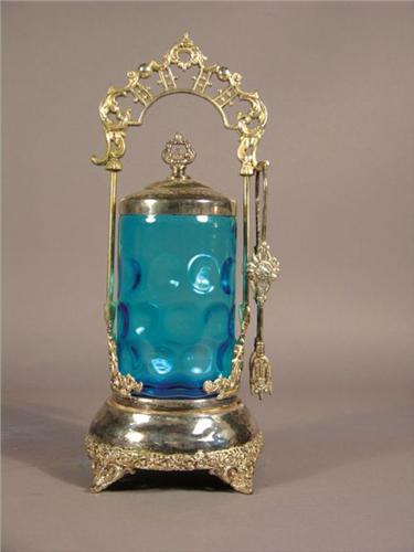 Pickle Caster with blue insert, thumbprint pattern. Some silver plate missing. No chips or cracks. 12 inches tall.