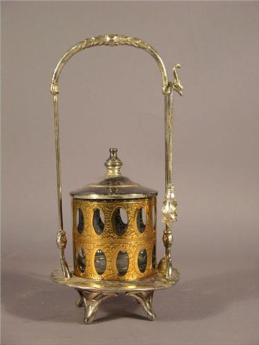 Pickle Caster with gold overlay glass insert. No chips or cracks. 10 3/4 inches tall.