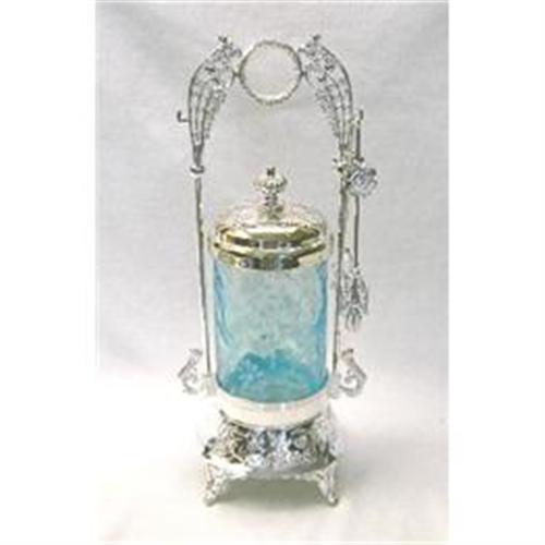 Pickle Castor with Tongs. Glass Insert is in Blue Opalescent Fern & Daisy Pattern by Fenton. Frame is Silverplate. Set is newer and would make a beautiful addition to any collection.