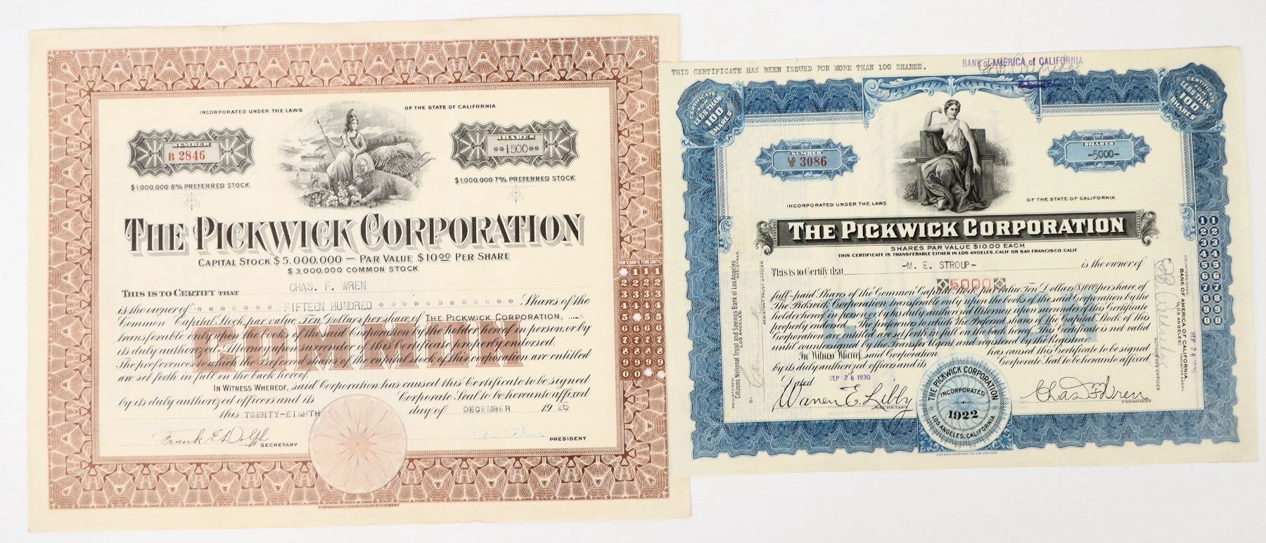 Lot of two different. Issued in 1926 and 1930. Neither cancelled. Inc. in California. Brown or blue borders, allegorical vignette. The Pickwick Corporation was a California-based transportation and hospitality company that emerged in the 1910s and 1920s, best known for its chain of Pickwick Hotels and the Pickwick Stage Lines. Its bus operations became one of the largest on the West Coast, eventually merging with Greyhound in the early 1930s.