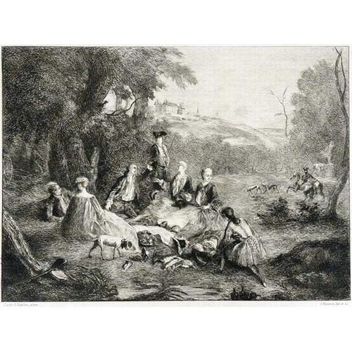 Engraving entitled "Louis XV et Mlles. de Nesle" depicting a country picnic after the hunt. The text on the print also reads: "Carl C. Vanloo, pinx., J. Hanriot, del et sc., Galerie A. Houssaye, Imp. Vve. A. Cadart, Paris." Carle Vanloo (1705 - 1765), a French painter and printmaker, was Premier Painter to the King under Louis XV and became a noble. He painted portraits of the royal family and decorated their apartments at Fontainbleau and Versailles. A similar oil painting by the same author is part of the collection of the Metropolitan Museum of Art, in New York. Signs of wear, tears and foxing on border can be partially covered by a mat at the time of framing. Please ask questions, request additional photos and shipping costs before bidding.