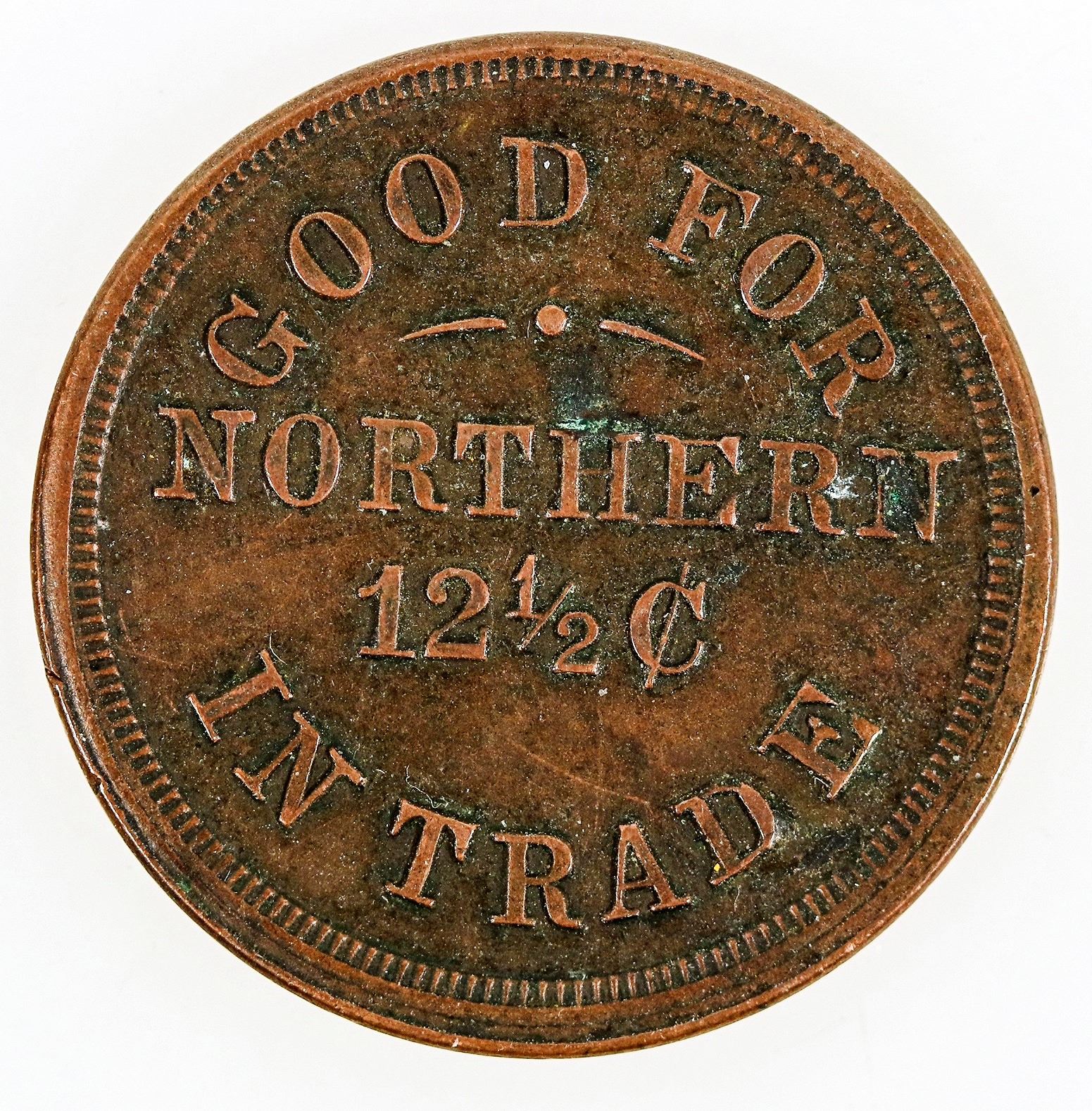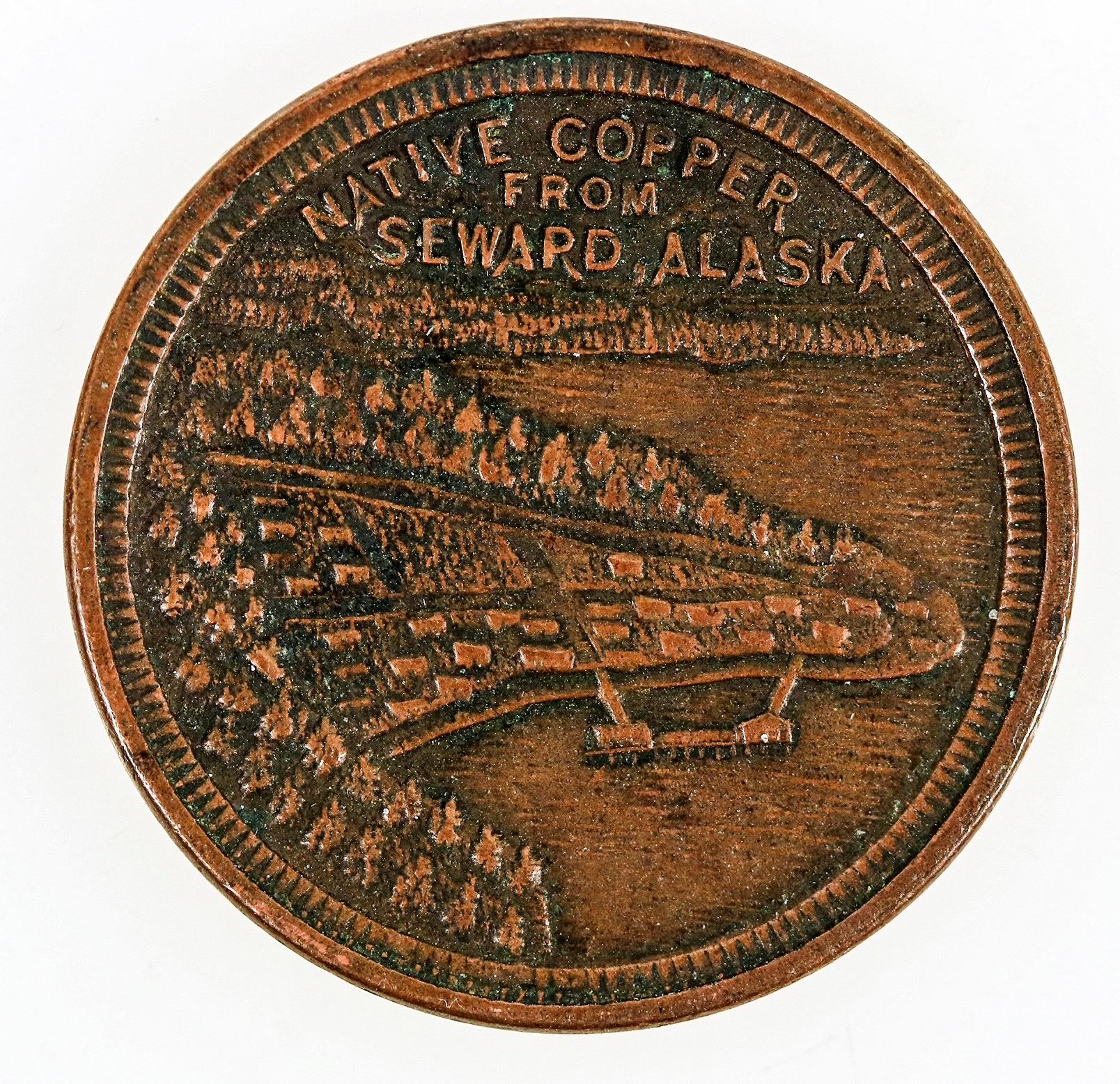 "Native Copper / From / Seward, Alaska / (overhead view of a mining camp surrounded by mountains) // Good For / Northern / 12.5 c. / In Trade. Perhaps VF, 28mm.
