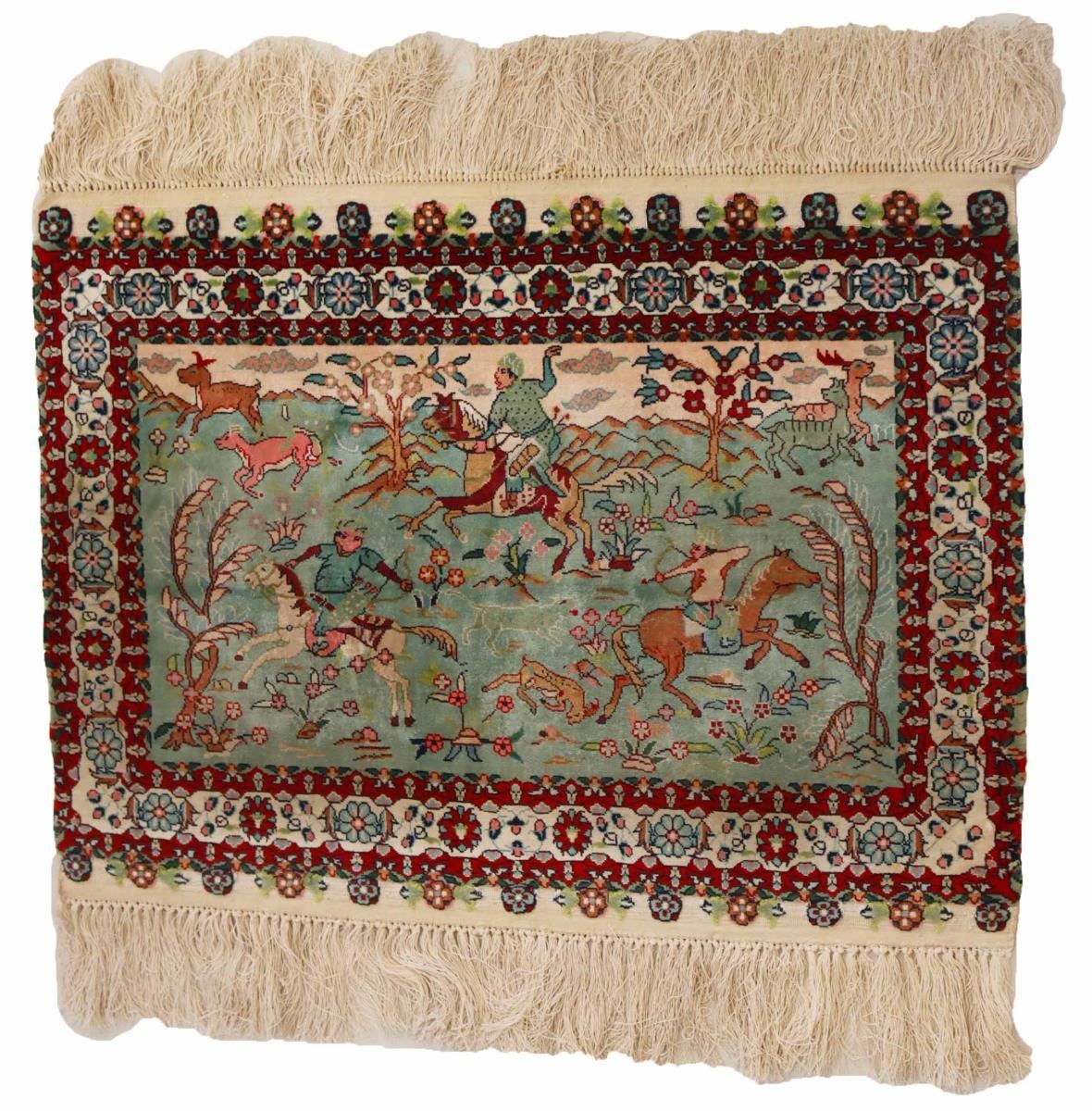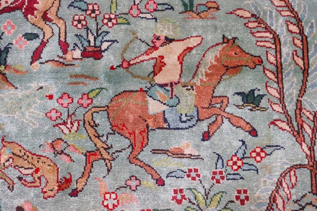 Vintage silk pictorial rug with an animal hunting design, Tabriz, Turkish Oriental. This hunting scene establishes a scene decorated by floral motifs scattered throughout the background. Three hunters on horseback chase after their prey, wielding finely crafted bows and arrows.