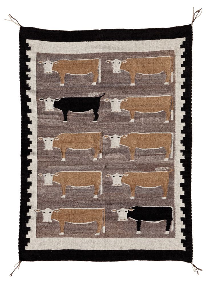 57” x 42” native hand-spun wool with natural colors and aniline dyed tan & black. 10 cows – 8 tan, 2 black – on natural background, circa 1950s - 1960s, excellent condition.