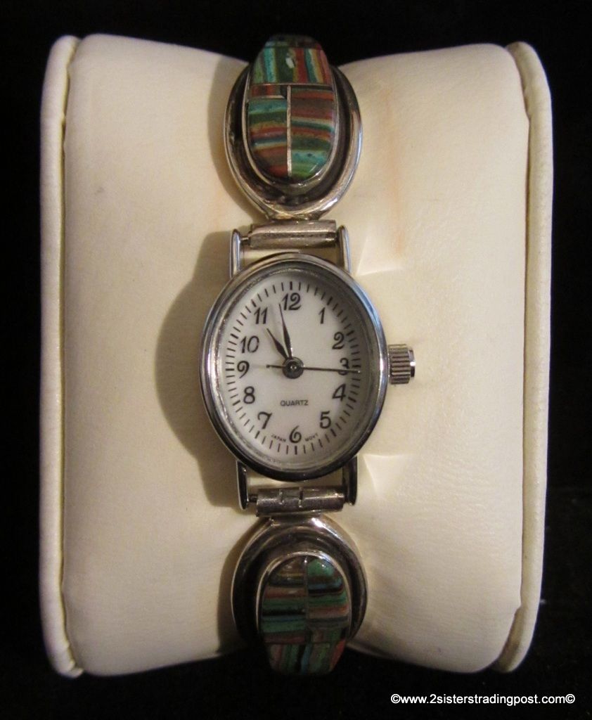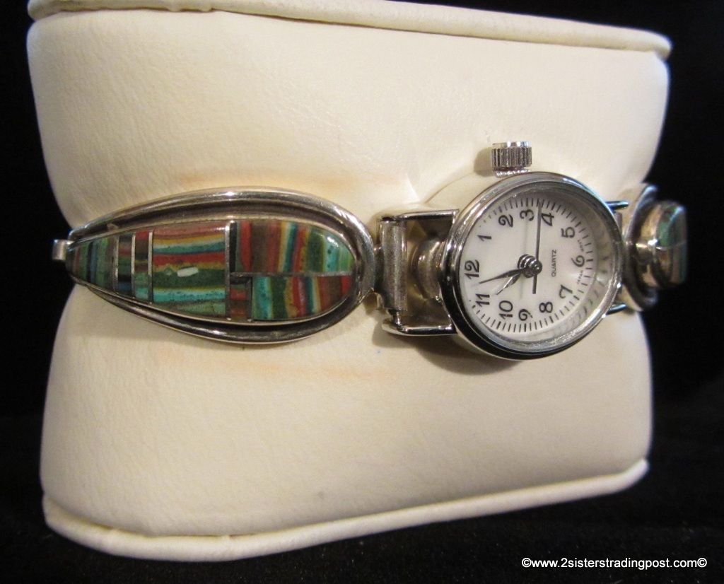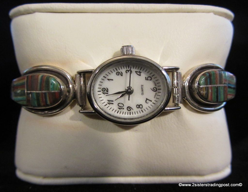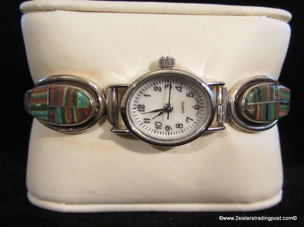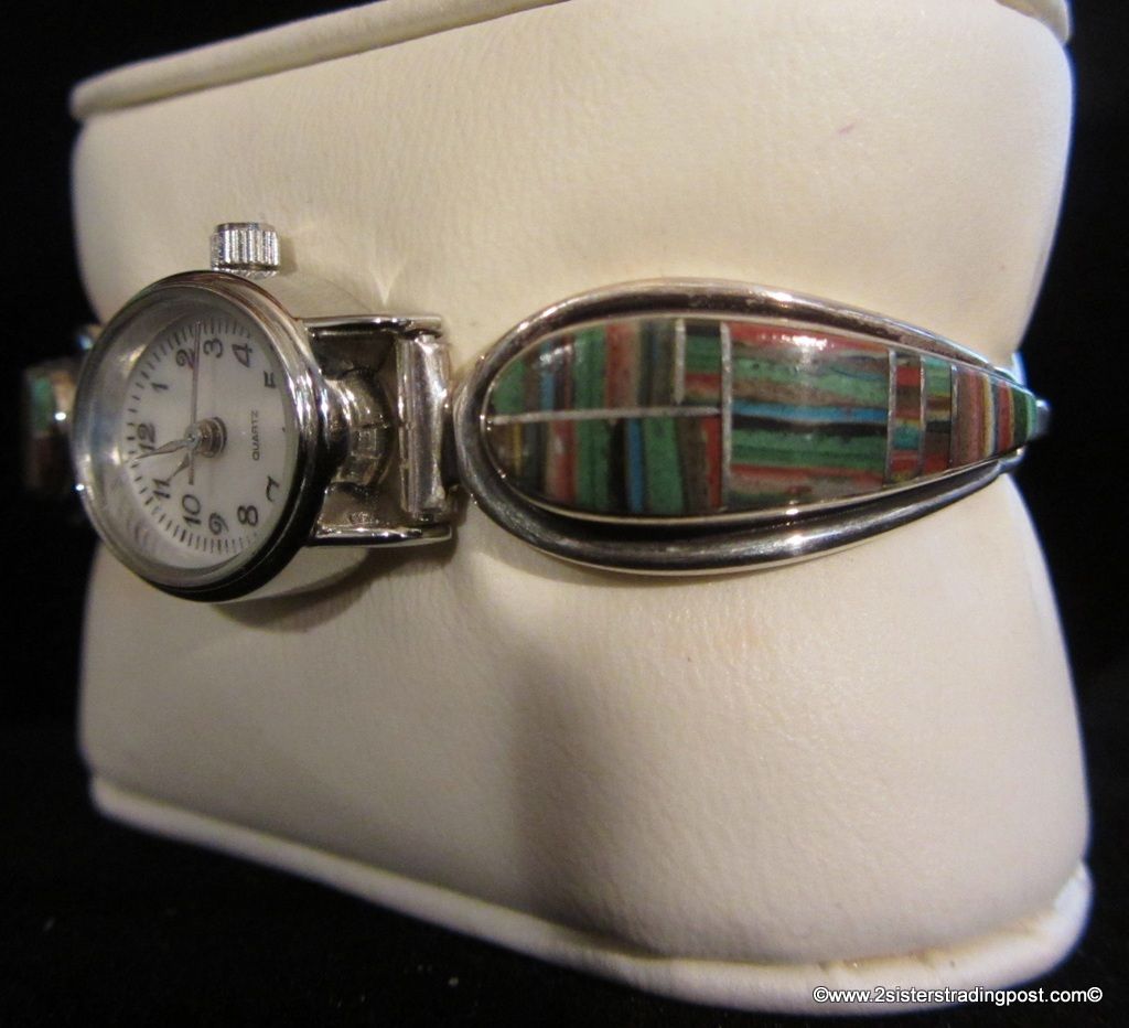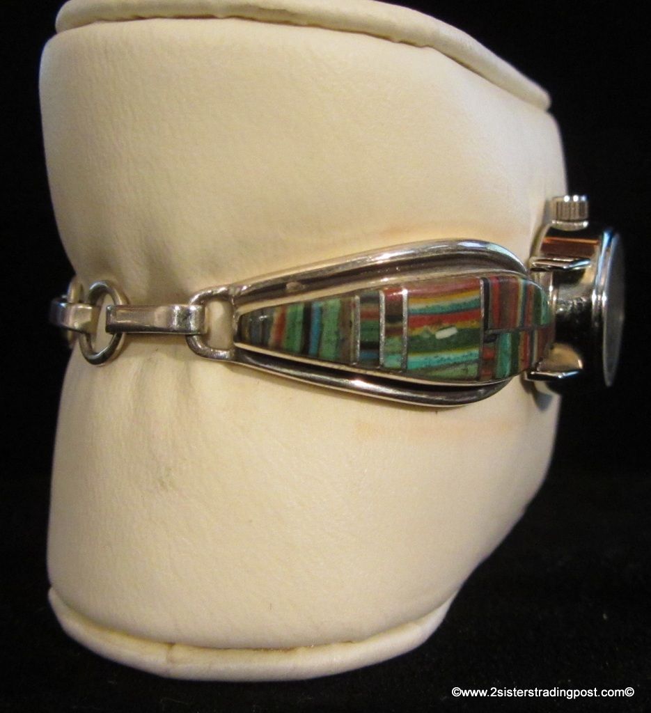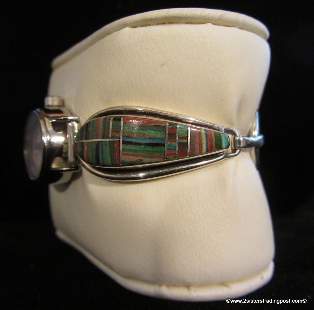 Beautiful Rainbow CalSilica inlay teardrop shaped watch tips with 14 individual piece of calsilica 7 on each side are laid into these sterling watch tips and separated by sterling. Comes with quartz timepiece and ring and connector chain strap with circle & bar closure measures 5 3/4" - 7 1/4". Piece has a pictorial signature and is stamped sterling and is © strap and closure are also sterling. NOTE: Owner states all timepiece worked when they were put into storage.