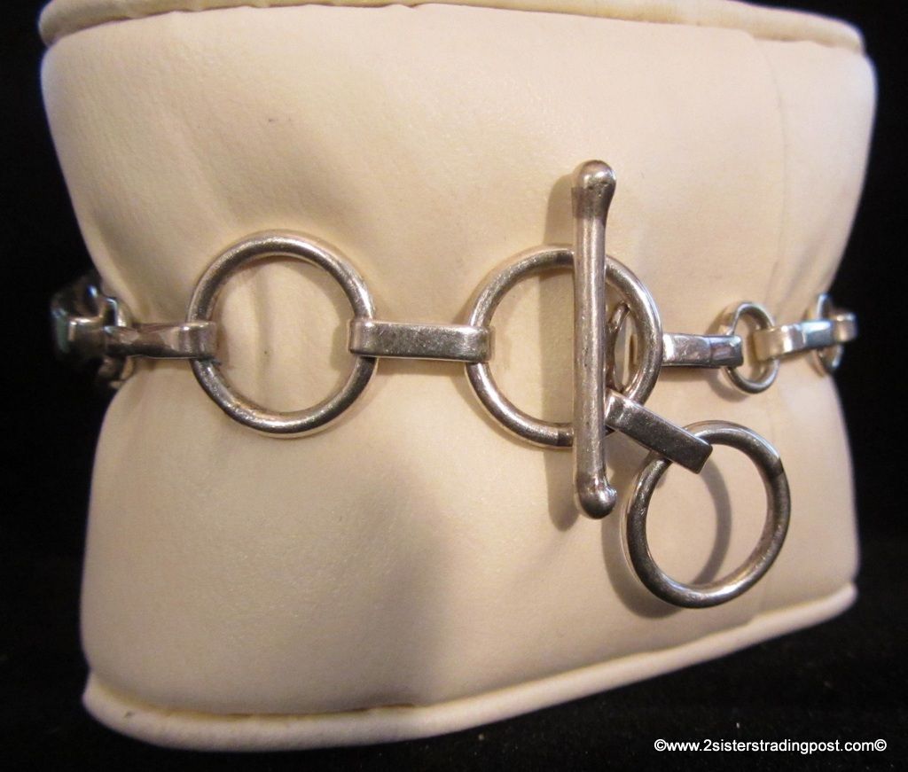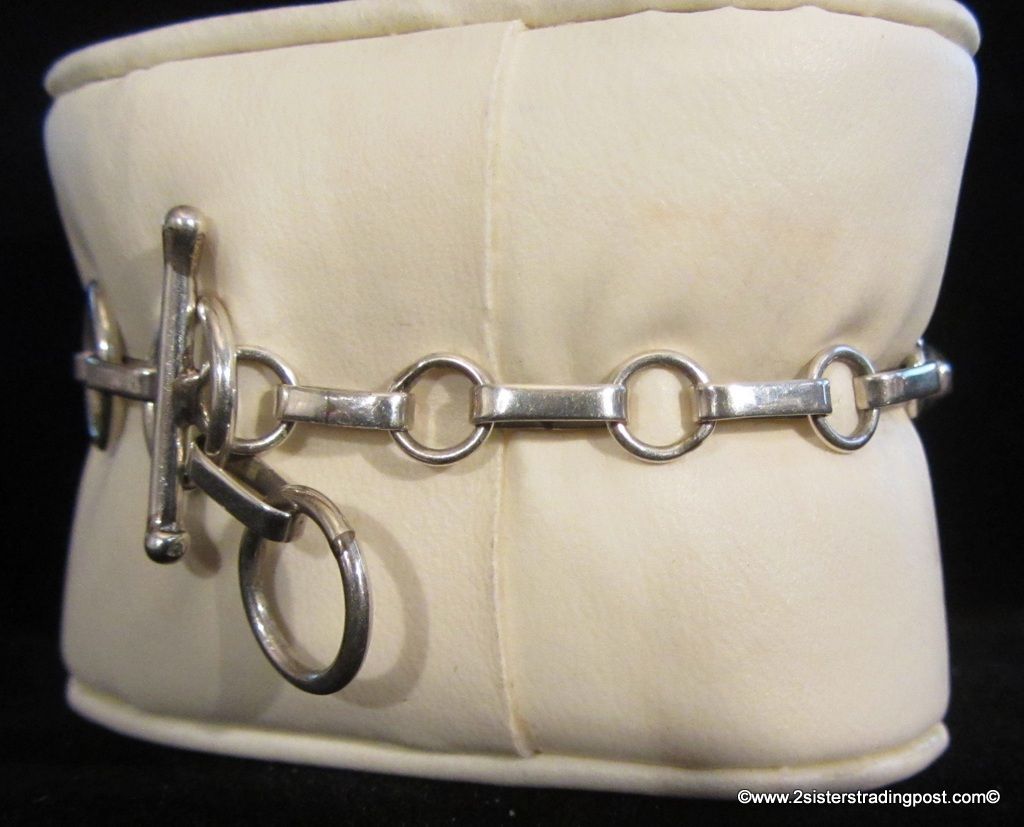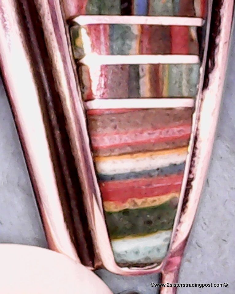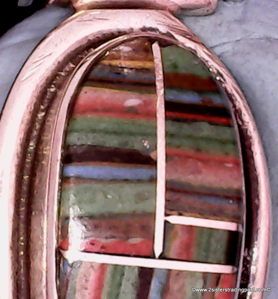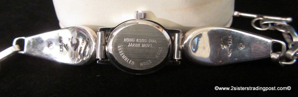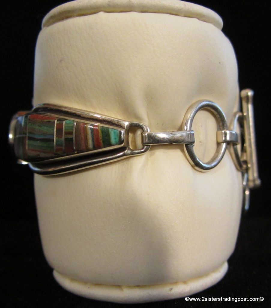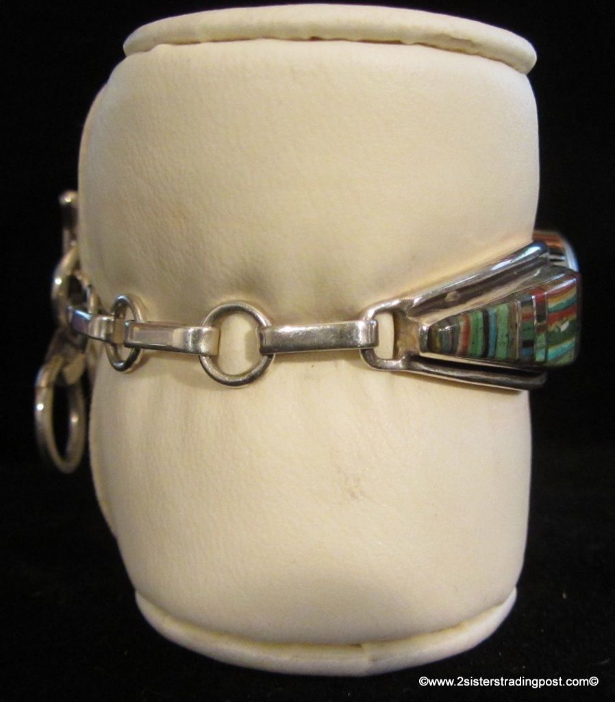 Beautiful Rainbow CalSilica inlay teardrop shaped watch tips with 14 individual piece of calsilica 7 on each side are laid into these sterling watch tips and separated by sterling. Comes with quartz timepiece and ring and connector chain strap with circle & bar closure measures 5 3/4" - 7 1/4". Piece has a pictorial signature and is stamped sterling and is © strap and closure are also sterling. NOTE: Owner states all timepiece worked when they were put into storage.