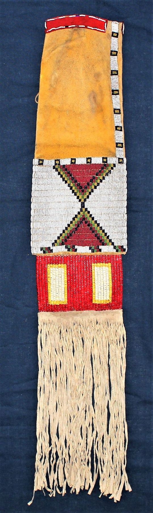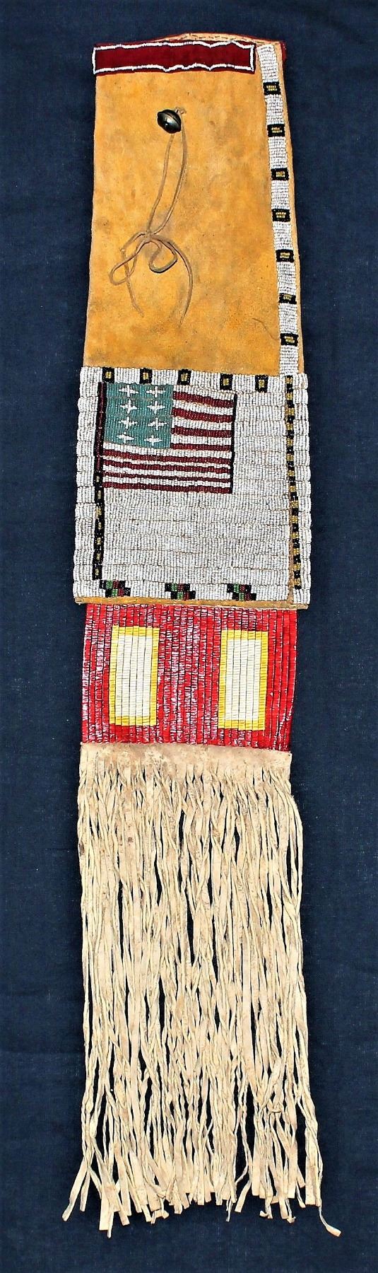 Gorgeous pictorial bag with American flag motif, showing yellow ochre, and great fringe.