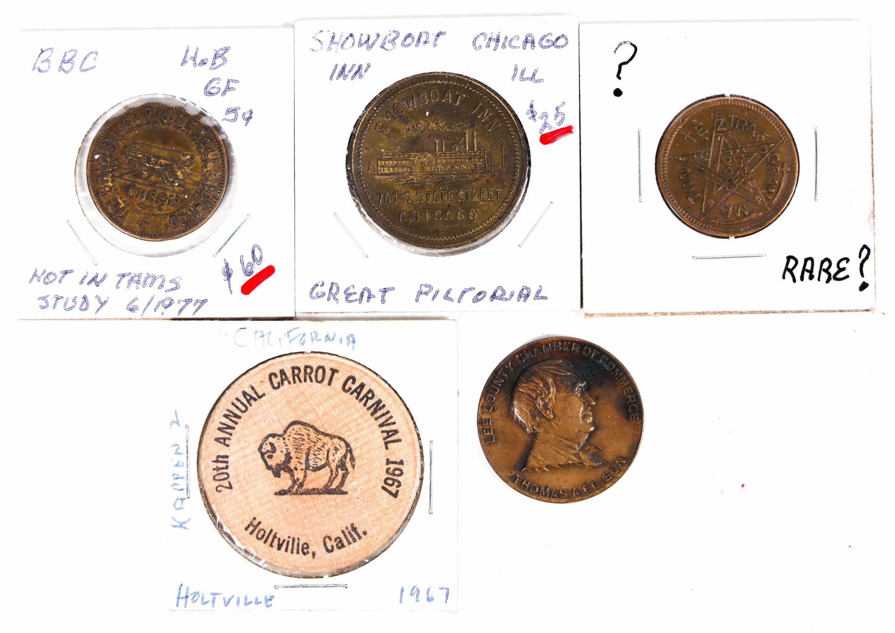 Five pictorial tokens: Showboat Inn, Chicago, Ill. (steamboat); Fort Myers, Fla. (tarpon); Te Tra Gram Ma; Holtville, Cal. (buffalo) wooden nickel; B.B.C. (billiard table).