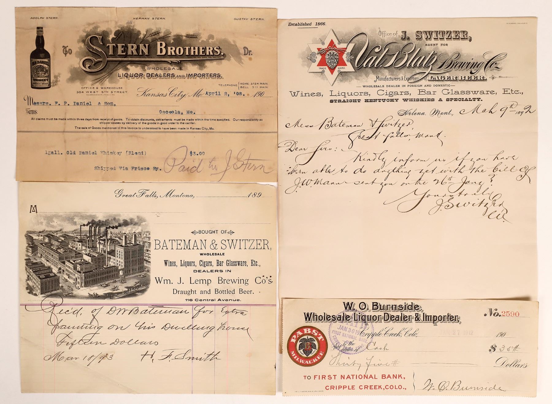 Pictorial billheads and letterheads. Bateman & Switzer, Great Falls, MT, 1893. W O Burnside Cripple Creek, Colo 1912.Stern Brothers, Kansas City, MO 1908. J. Switzer, Helena, Mont. 1892.