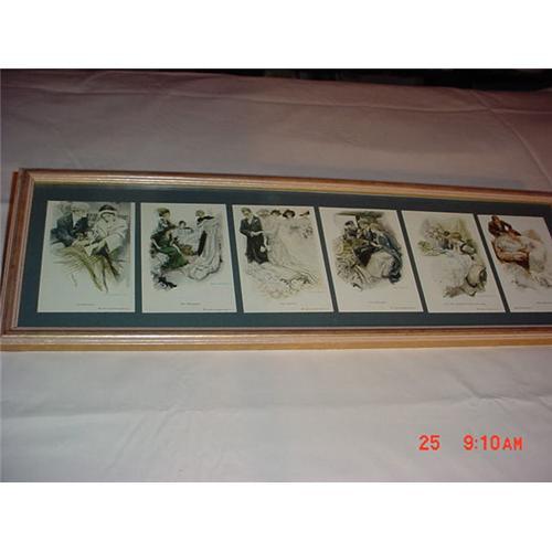 Six 3x5 prints telling a progressive story (all in one frame), each entitled: "The Proposal", "The Trousseau", "The Wedding", "The Honeymoon", "The First Evening in their New Home", and "Their New Love". The original picture frame and backing had disintegrated so badly it had to be reframed. It is framed with conservation materials.
