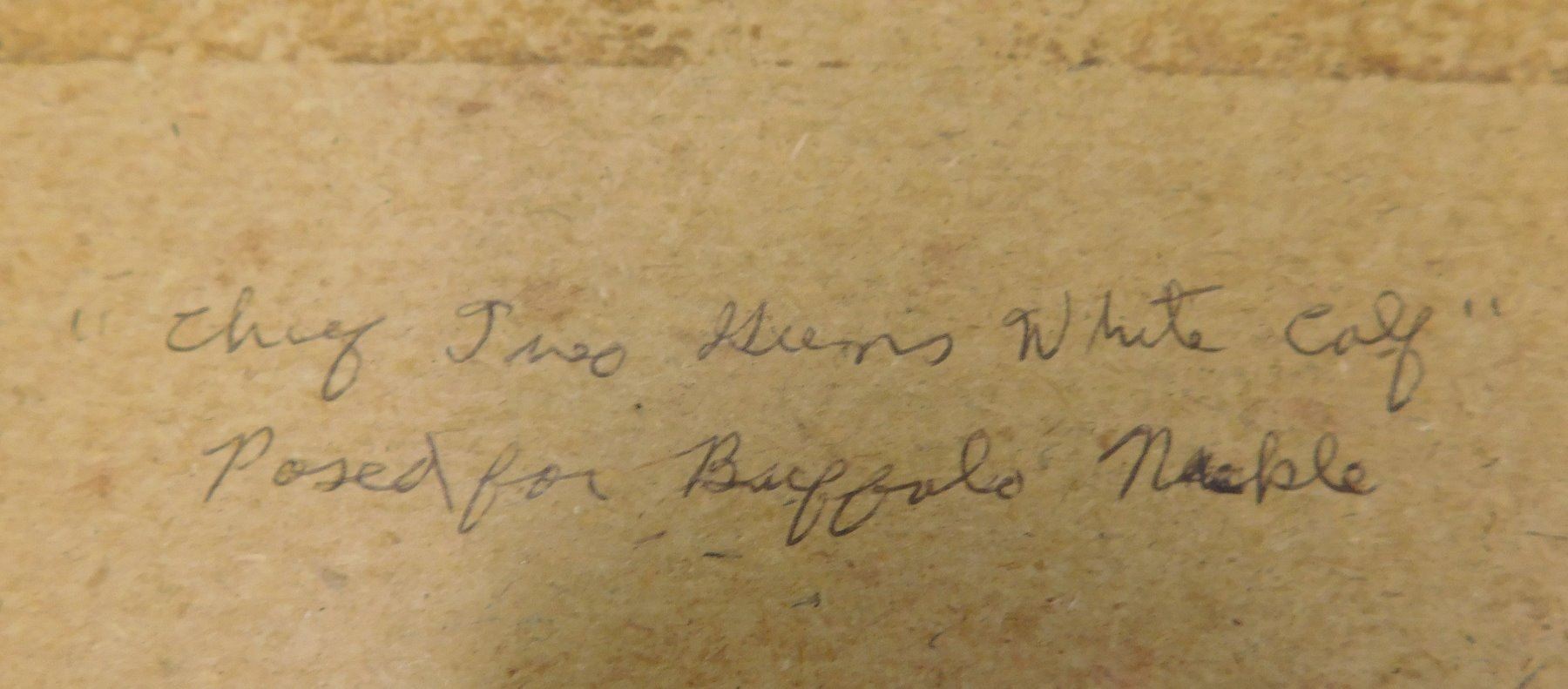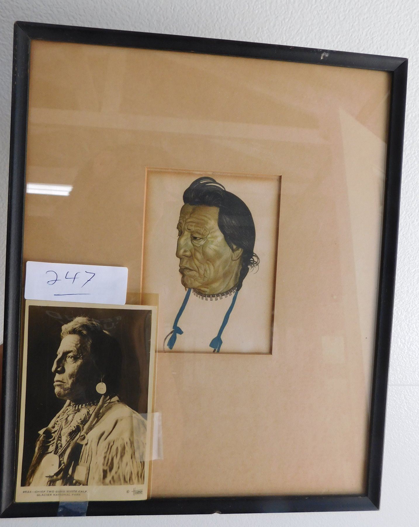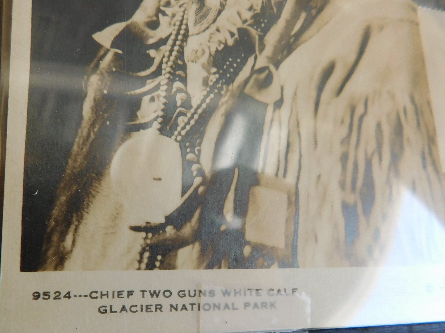 Picture & Card, circa 1930s. Made of paper, wood and glass, the item is 10" x 12". This man posed for Buffalo Nickel based on the information on the frame, man named Chief Two Guns White Calf. Condition: good, see images. Shipping: $28.50 w/insurance and signature, wrapped.