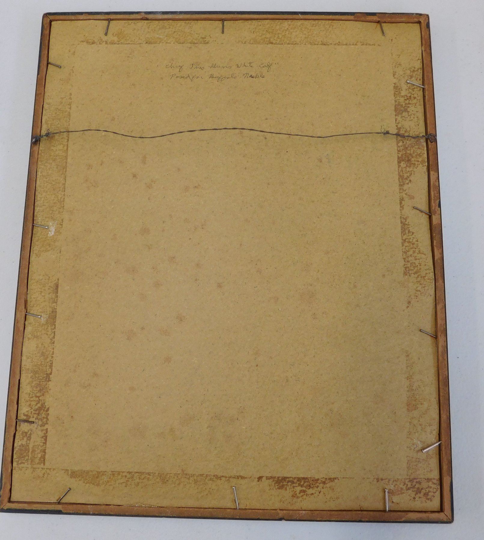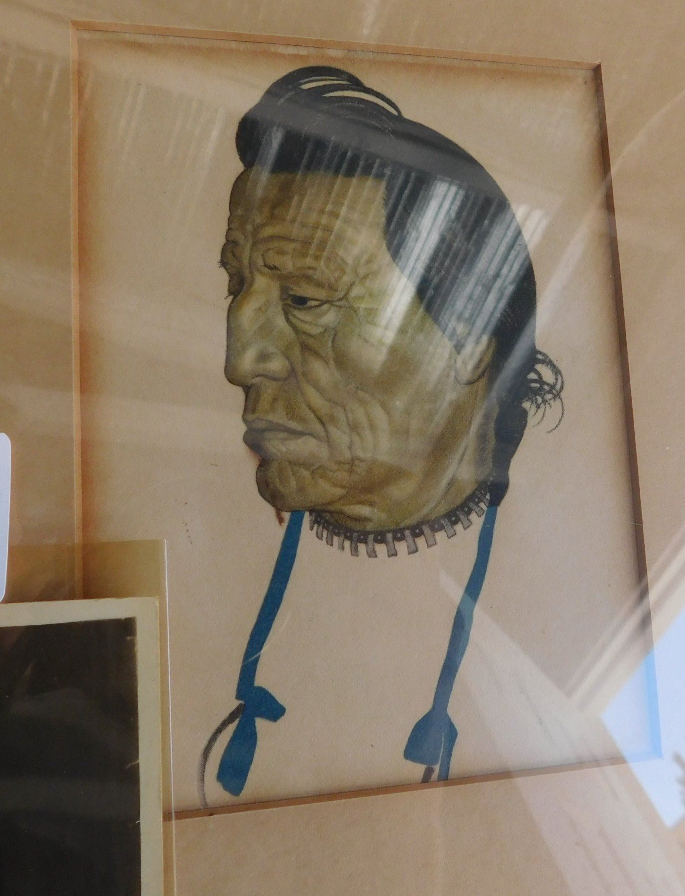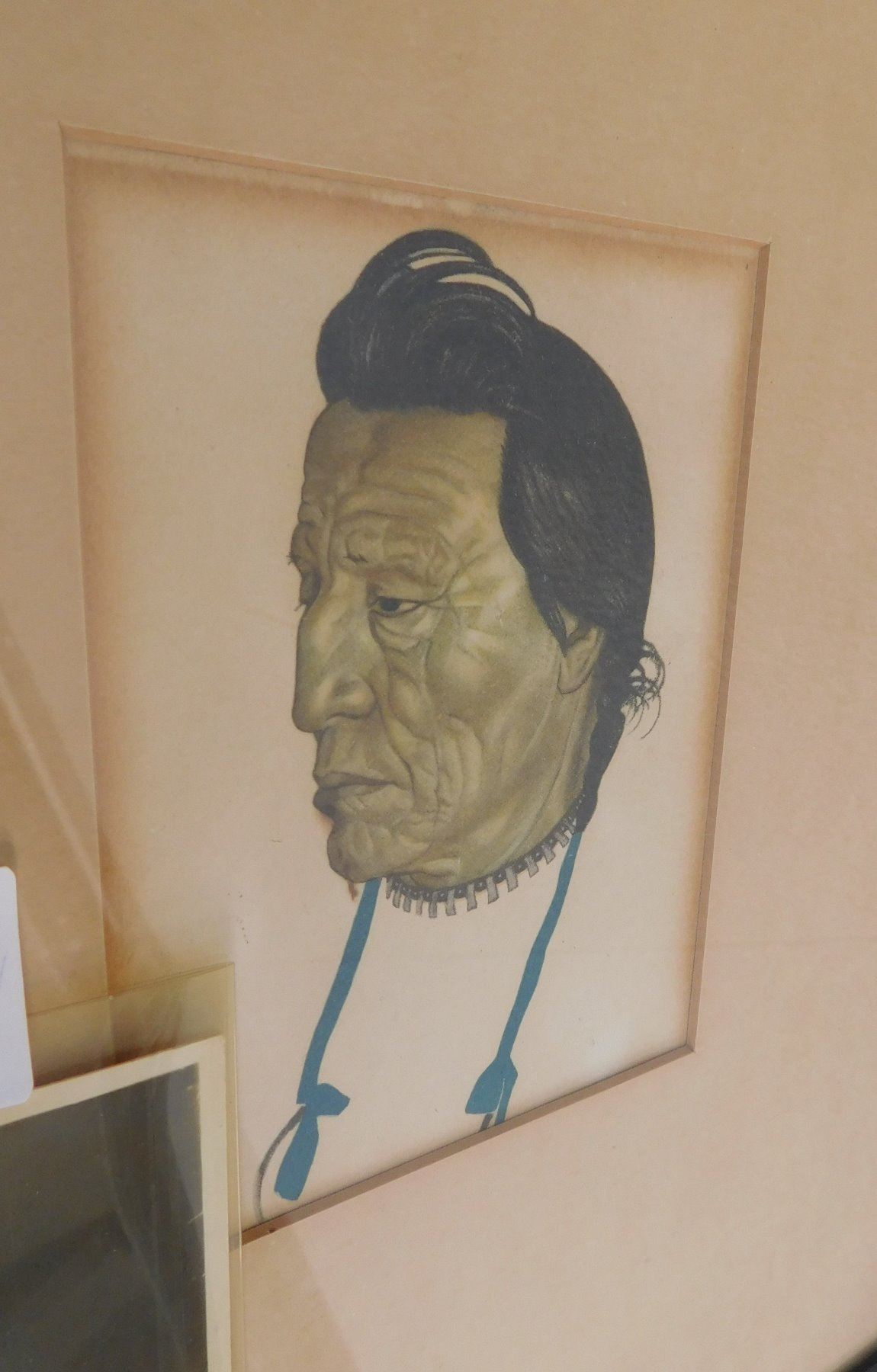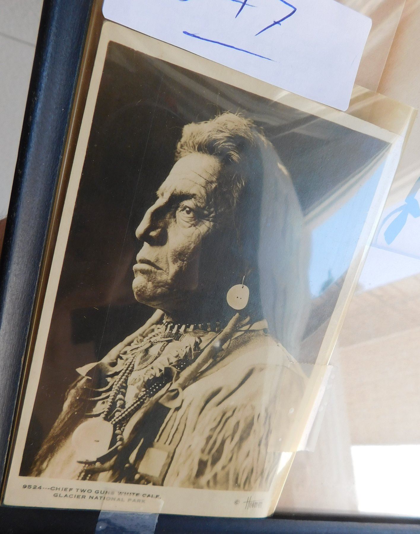 Picture & Card, circa 1930s. Made of paper, wood and glass, the item is 10" x 12". This man posed for Buffalo Nickel based on the information on the frame, man named Chief Two Guns White Calf. Condition: good, see images. Shipping: $28.50 w/insurance and signature, wrapped.