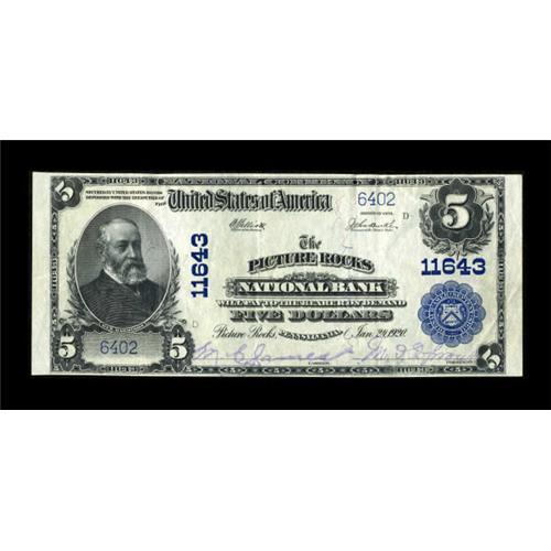 <B>Picture Rocks, PA</B></I> - $5 1902 Plain Back Fr. 607 <B>The Picture Rocks NB</B></I> Ch. # 11643<BR> The last time we had a note on this colorful bank title was in January 2001. It was in a similar grade and it brought $3300. The market has strengthened since those halcyon days and we expect this <B>Very Fine+ </B></I>$5 to go for...<BR><BR><b>Shipping:</b> Coins & Currency (<a target="_blank" href="http://www.heritageauctions.com/common/shipping.php">view shipping information</a>)