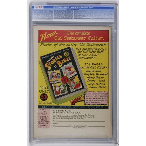 Trying to keep all of the variants of this series straight is enough to make your brain explode, but it becomes a bit simpler if you remember that the DC issues came first -- M. C. Gaines later used his creation as the basis for the EC line. As for the story, it adapts the most popular book of all time, 'nuff said! The cover art is by Dan Cameron. As of this writing, only one copy (a Gaines File copy) has received a higher grade than Davis Crippen's specimen. Overstreet 2006 NM- 9.2 value = $215. CGC census 11/06: 2 in 9.4, 1 higher. <I>From the Crippen Collection.</B></I><BR><BR><b>Shipping:</b> Slabbed Comic (<a target="_blank" href="http://www.heritageauctions.com/common/shipping.php">view shipping information</a>)