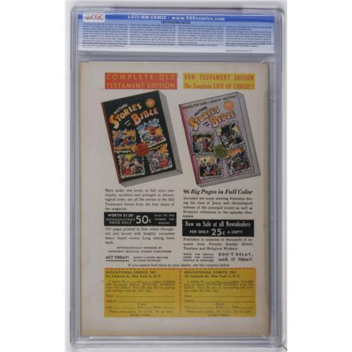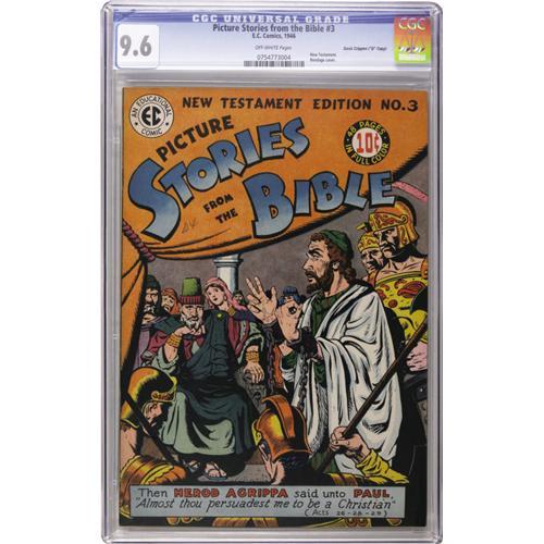<B>Picture Stories from the Bible New Testament Edition #3 Davis Crippen ("D Copy") pedigree (EC, 1946) CGC NM+ 9.6 Off-white pages.</B></I> This is the nicest copy we've ever offered of this one! Allen Simon drew Paul's appeal to Herod Agrippa on this issue's cover, while Don Cameron handled the interior art for the issue. Overstreet 2006 NM- 9.2 value = $215. CGC census 11/06: 3 in 9.6, 1 higher. <I>From the Crippen Collection.</B></I><BR><BR><b>Shipping:</b> Slabbed Comic (<a target="_blank" href="http://www.heritageauctions.com/common/shipping.php">view shipping information</a>)