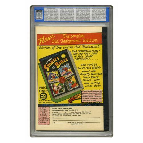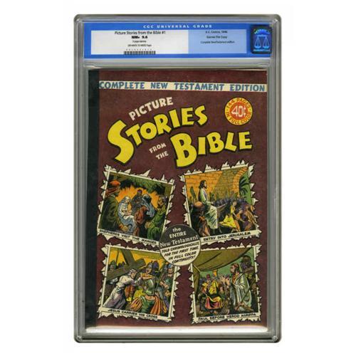 <B>Picture Stories from the Bible Complete New Testament Edition - 40-Cent Cover - Gaines File pedigree (EC, 1946) CGC NM+ 9.6 Off-white to white pages.</B></I> This 144-pager collected all three of the previously published New Testament comics. Note that while CGC has certified this book as a Gaines File Copy, no certificate accompanies this lot. CGC notes, "6 pages siamese." Overstreet 2005 NM- 9.2 value = $310. CGC census 12/05: 1 in 9.6, none higher.