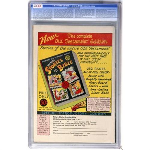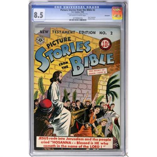 <B>Picture Stories from the Bible - New Testament #2 Vancouver pedigree (EC, 1946) CGC VF+ 8.5 Off-white to white pages.</B></I> Death of Jesus. CGC notes, "Small piece out centerfold, slightly affects story." Overstreet 2007 VF 8.0 value = $106; VF/NM 9.0 value = $163. CGC census 6/07: 1 in 8.5, 6 higher.<BR><BR><b>Shipping:</b> Comics - Slabbed (certified) (<a target="_blank" href="http://www.heritageauctions.com/common/shipping.php">view shipping information</a>)