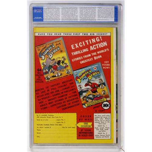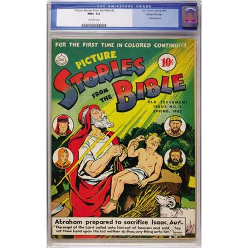 <B>Picture Stories from the Bible Old Testament Edition #3 Gaines File pedigree (DC, 1943) CGC NM+ 9.6 Off-white pages.</B></I> Note that while CGC has certified this book as a Gaines File Copy, no certificate accompanies this lot. Overstreet 2007 NM- 9.2 value = $290. CGC census 6/07: 3 in 9.6, 2 higher.<BR><BR><b>Shipping:</b> Comics - Slabbed (certified) (<a target="_blank" href="http://www.heritageauctions.com/common/shipping.php">view shipping information</a>)