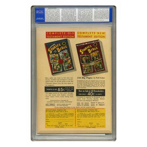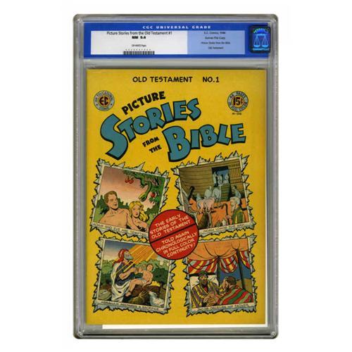 <B>Picture Stories from the Bible Old Testament Edition #1 Gaines File pedigree (EC, 1946) CGC NM 9.4 Off-white pages.</B></I> While EC's initial Bible comic series presented the stories out of order (with Genesis not appearing until issue #3!), these 1946 printings took a chronological approach. Note that while CGC has certified this book as a Gaines File Copy, no certificate accompanies this lot. Overstreet 2005 NM- 9.2 value = $200. CGC census 12/05: 1 in 9.4, 1 higher.