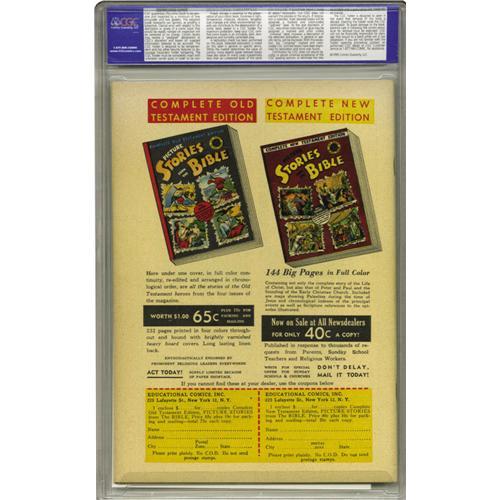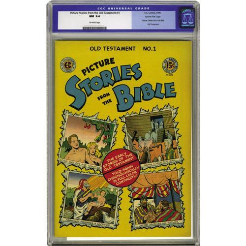 <B>Picture Stories from the Bible Old Testament Edition #1 Gaines File pedigree (EC, 1946) CGC NM 9.4 Off-white pages.</B></I> While EC's initial Bible comic series presented the stories out of order (with Genesis not appearing until issue #3!), these 1946 printings took a chronological approach. Note that while CGC has certified this book as a Gaines File Copy, no certificate accompanies this lot. Overstreet 2006 NM- 9.2 value = $215. CGC census 03/06: 1 in 9.4, 1 higher.