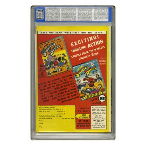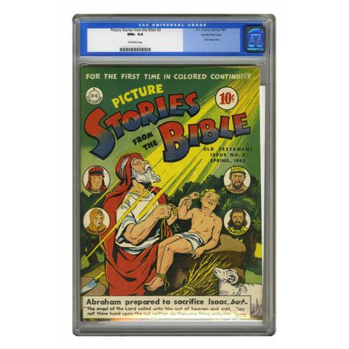 <B>Picture Stories from the Bible Old Testament Edition #3 Gaines File pedigree (DC, 1943) CGC NM+ 9.6 Off-white to white pages.</B></I> The fact that Genesis is covered in issue #3 shows that these issues skipped around a bit chronologically, something that was rectified when they were rearranged for collected editions. Note that while CGC has certified this book as a Gaines File Copy, no certificate accompanies this lot. Overstreet 2005 NM- 9.2 value = $270. CGC census 11/05: 3 in 9.6, 2 higher.