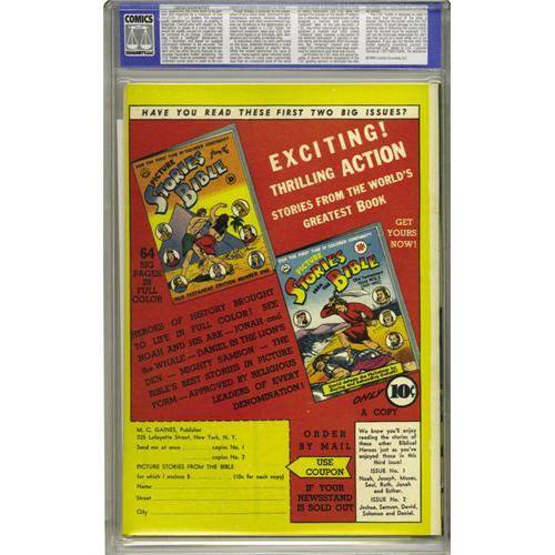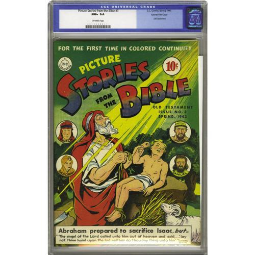 <B>Picture Stories from the Bible Old Testament Edition #3 Gaines File pedigree (DC, 1943) CGC NM+ 9.6 Off-white to white pages.</B></I> The fact that Genesis is covered in issue #3 shows that these issues skipped around a bit chronologically, something that was rectified when they were rearranged for collected editions. Note that while CGC has certified this book as a Gaines File Copy, no certificate accompanies this lot. Overstreet 2006 NM- 9.2 value = $325. CGC census 03/06: 3 in 9.6, 2 higher.