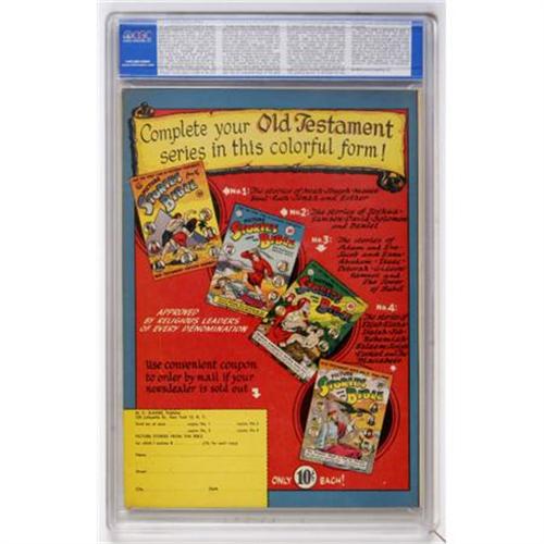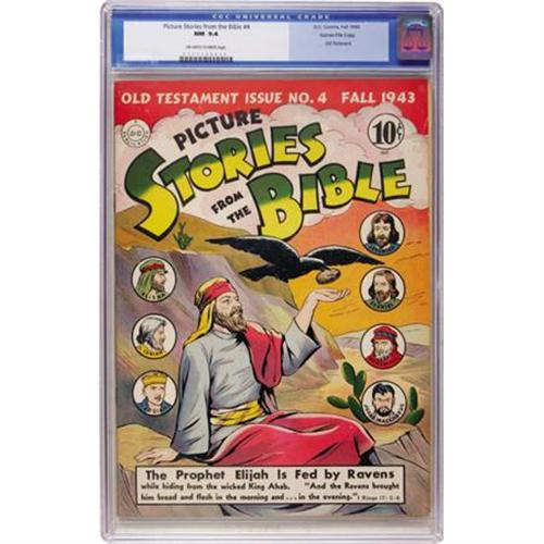 <B>Picture Stories from the Bible - Old Testament Issue No. 4 (DC, 1943) CGC NM 9.4 Off-white to white pages.</B></I> Near Mint Copy boasts the highest grade CGC has certified to date for this <I>DC </B></I>issue. CGC has certified this as from the Gaines Files, but no certificate accompanies the book. Overstreet 2007 NM- 9.2 value = $290. CGC census 6/07: 3 in 9.4, none higher.<BR><BR><b>Shipping:</b> Comics - Slabbed (certified) (<a target="_blank" href="http://www.heritageauctions.com/common/shipping.php">view shipping information</a>)