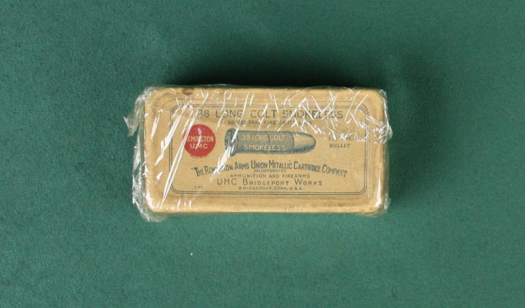 Picture box of .38 Long Colt Smokeless  cartridges by Remington/UMC in overall very  good condition; cellophane wrapped.  Est.:   $20-$40.