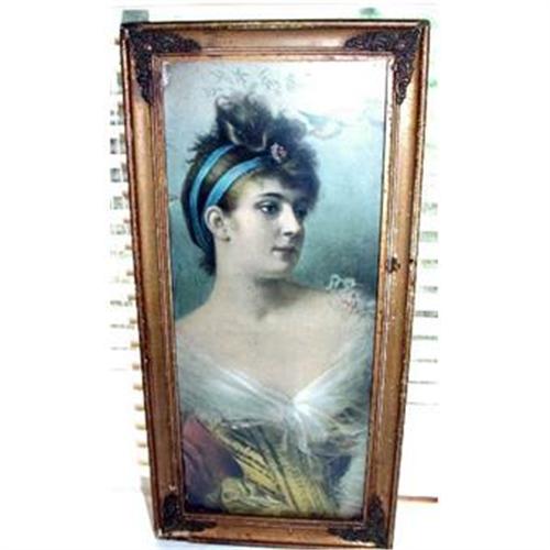 The perfect addition to a Victorian decor, this old picture of a lovely young lady is encased in a beautiful wood gilt frame. Colors are vivid and true. A few chipped places in the frame, but overall in very good condition. Bought at an estate sale, so I'm not certain of exact age. Framed size is 7.5" wide x 15.5" tall.