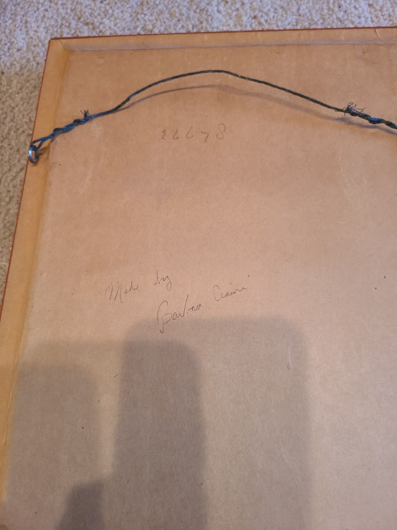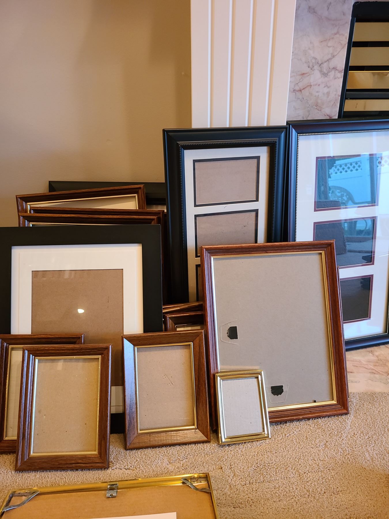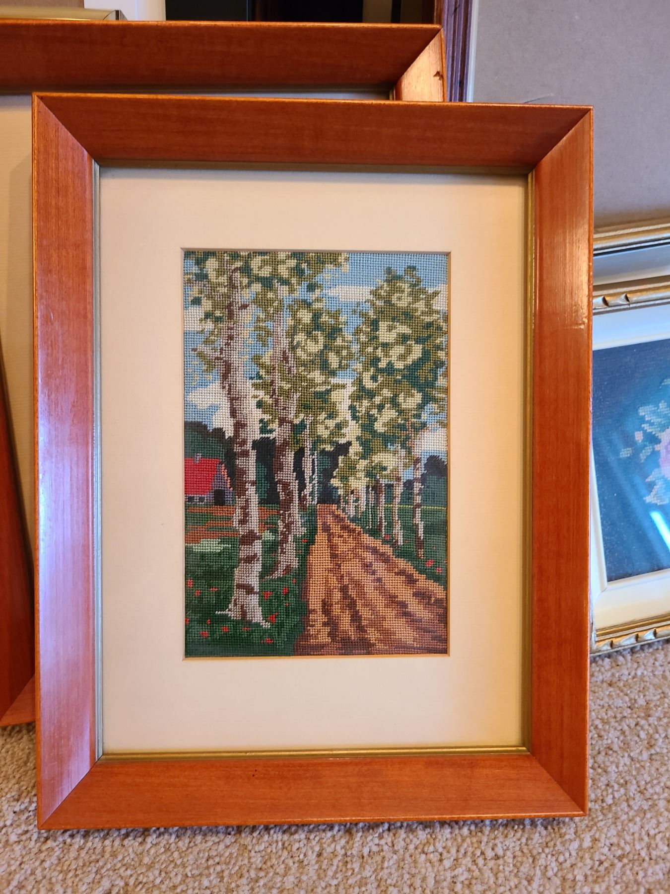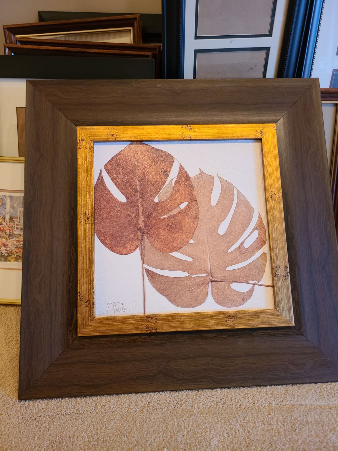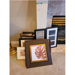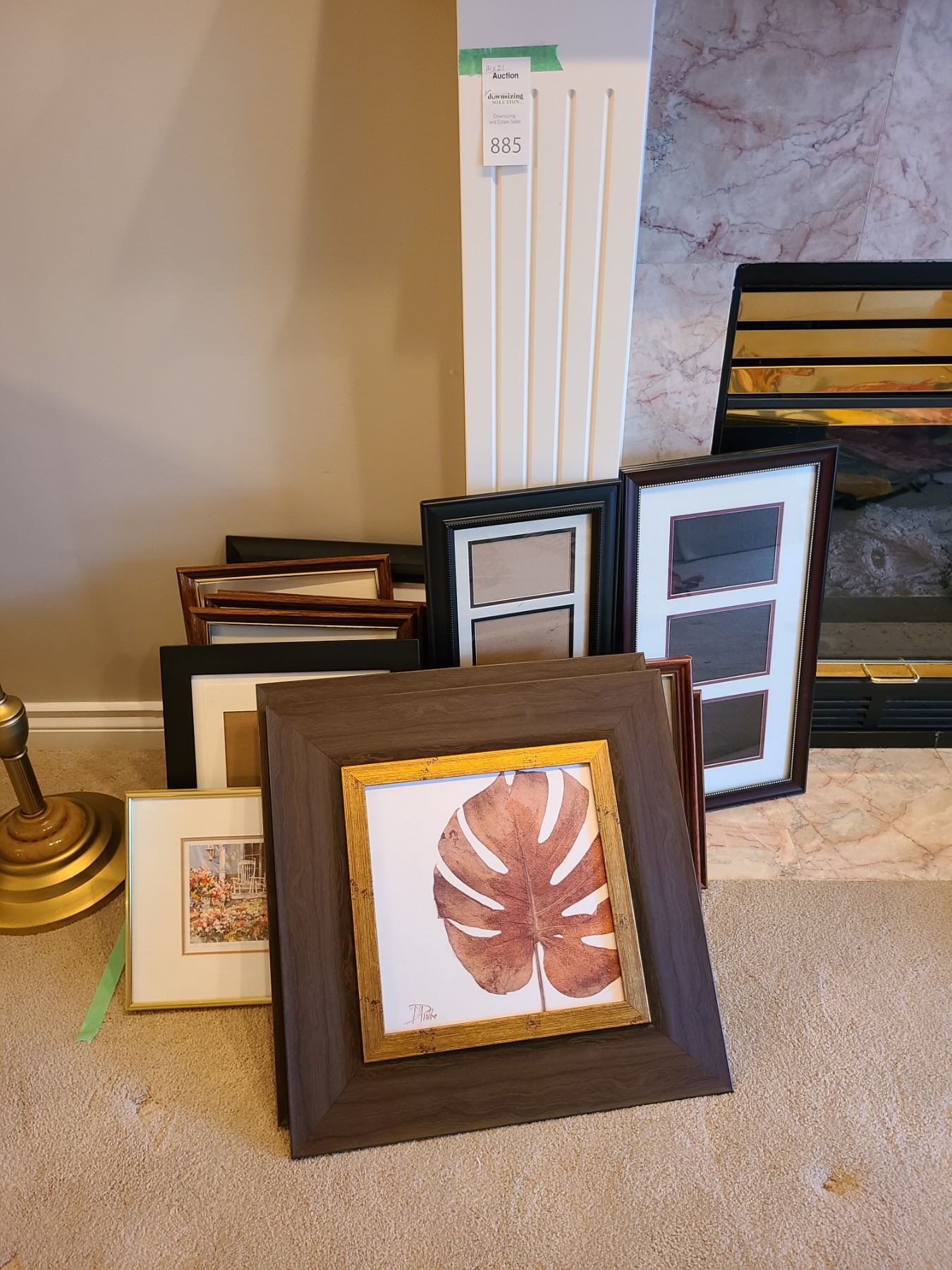 Lot includes glass picture frames, needlepoint pictures, and 2 leaf pictures 21x21. Bring boxes. Pickup 9 am.